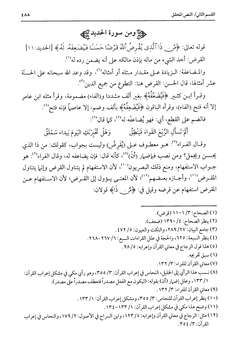 وقال الفراء: هو معطوف على (يُقْرِضُ) وليست بجواب، كقولك: من ذا الذي يحسن ويحمل؟ ومن نصب فبإضمار (أن) ، كأنه قال: فإن يضاعفه له، وقال الفراء: هو جواب الاستفهام، ومنع ذلك البصريون، لأن الاستفهام لم يتناول القرض وإنما يتناول المقرض، وأجازه بعضهم؛ لأن المعنى يؤول إلى القرض؛ لأن الاستفهام عن المقرض استفهام عن قرضه وقيل في: {مَنْ ذَا} قولان: