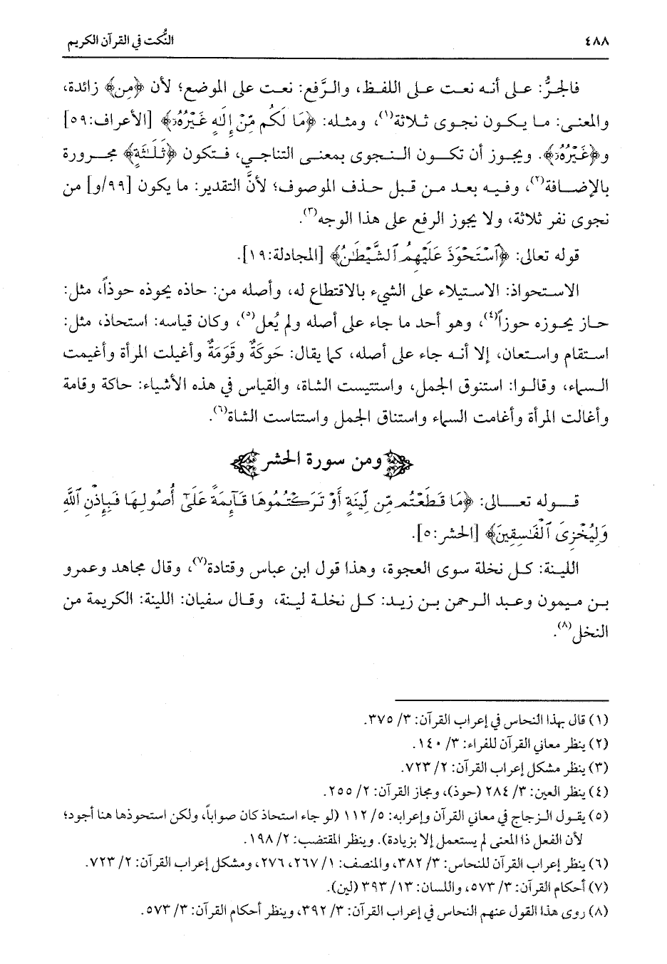 فالجر: على أنه نعت على اللفظ، والرفع: نعت على الموضع؛ لأن {مِنَ} زائدة، والمعنى: ما يكون نجوى ثلاثة، ومثله: {مَا لَكُمْ مِنْ إِلَهٍ غَيْرُهُ} [الأعراف: 59] و {غَيْرُهُ} . ويجوز أن تكون النجوى بمعنى التناجي، فتكون {ثَلَاثَةٍ} مجرورة بالإضافة، وفيه بعد من قبل حذف الموصوف؛ لأن التقدير: ما يكون من نجوى نفر ثلاثة، ولا يحوز الرفع على هذا الوجه.