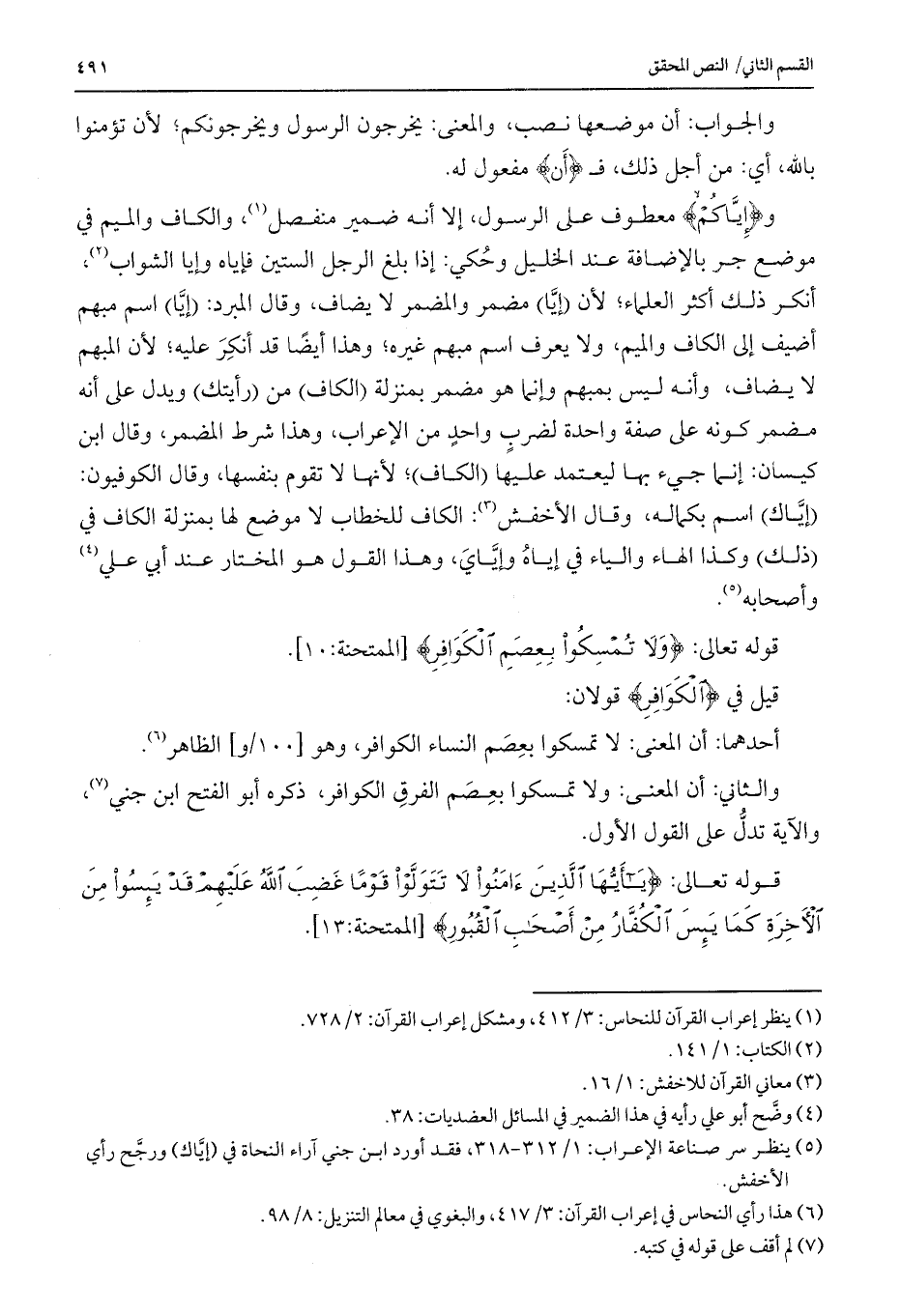 و {إِيَّاكُمْ} معطوف على الرسول، إلا أنه ضمير منفصل، والكاف والميم في موضع جر بالإضافة عند الخليل وحكي: إذا بلغ الرجل الستين فإياه وإيا الشواب، أنكر ذلك أكثر العلماء؛ لأن (إِيَّا) مضمر والمضمر لا يضاف، وقال المبرد: (إِيَّا) اسم مبهم أضيف إلى الكاف والميم، ولا يعرف اسم مبهم غيره؛ وهذا أيضاً قد أنكر عليه؛ لأن المبهم لا يضاف، وأنه ليس بمبهم وإنما هو مضمر بمنزلة (الكاف) من (رأيتك) ويدل على أنه مضمر كونه على صفة واحدة لضرب واحد من الإعراب، وهذا شرط المضمر، وقال ابن كيسان: إنما جيء بها ليعتمد عليها (الكاف) ؛ لأنها لا تقوم بنفسها، وقال الكوفيون: (إِيَّاك) اسم بكماله، وقال الأخفش: الكاف للخطاب لا موضع لها بمنزلة الكاف في (ذلك) وكذا الهاء والياء في إياه وإياي، وهذا القول هو المختار عند أبي علي وأصحابه.