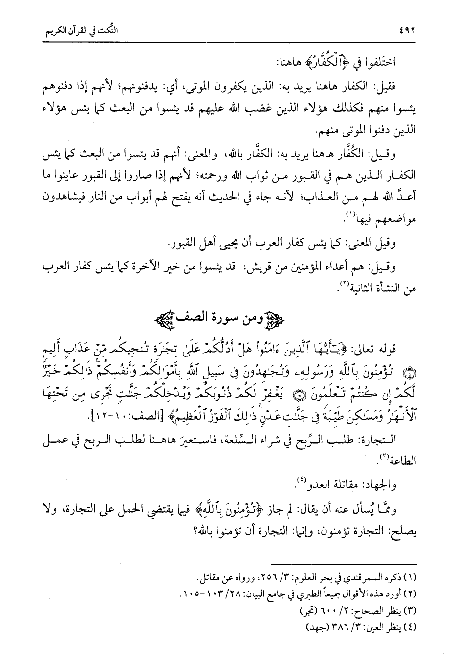 قوله تعالى: {يَا أَيُّهَا الَّذِينَ آمَنُوا هَلْ أَدُلُّكُمْ عَلَى تِجَارَةٍ تُنْجِيكُمْ مِنْ عَذَابٍ أَلِيمٍ (10) تُؤْمِنُونَ بِاللَّهِ وَرَسُولِهِ وَتُجَاهِدُونَ فِي سَبِيلِ اللَّهِ بِأَمْوَالِكُمْ وَأَنْفُسِكُمْ ذَلِكُمْ خَيْرٌ لَكُمْ إِنْ كُنْتُمْ تَعْلَمُونَ (11) يَغْفِرْ لَكُمْ ذُنُوبَكُمْ وَيُدْخِلْكُمْ جَنَّاتٍ تَجْرِي مِنْ تَحْتِهَا الْأَنْهَارُ وَمَسَاكِنَ طَيِّبَةً فِي جَنَّاتِ عَدْنٍ ذَلِكَ الْفَوْزُ الْعَظِيمُ} [الصف: 10-12] .