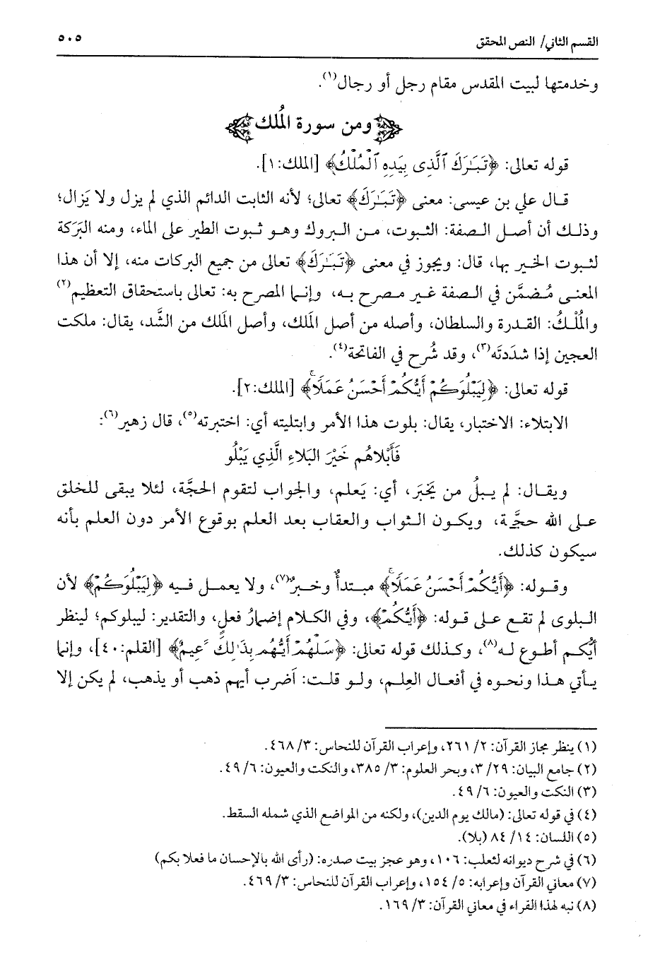 قال علي بن عيسى: معنى {تَبَارَكَ} تعالى؛ لأنه الثابت الدائم الذي لم يزل ولا يزال؛ وذلك أن أصل الصفة: الثبوت، من البروك وهو ثبوت الطير على الماء، ومنه البركة لثبوت الخير بها، قال: ويجوز في معنى {تَبَارَكَ} تعالى من جميع البركات منه، إلا أن هذا المعنى مضمن في الصفة غير مصرح به، وإنما المصرح به: تعالى باستحقاق التعظيم والُملْكُ: القدرة والسلطان، وأصله من أصل المَلك، وأصل المَلك من الشد، يقال: ملكت العجين إذا شددته، وقد شرح في الفاتحة.