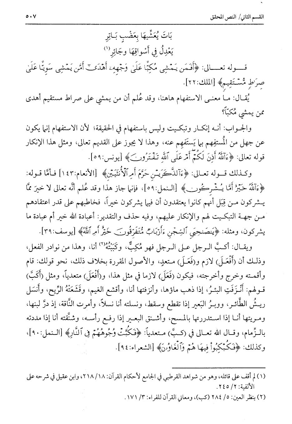 قوله تعالى: {أَفَمَنْ يَمْشِي مُكِبًّا عَلَى وَجْهِهِ أَهْدَى أَمَّنْ يَمْشِي سَوِيًّا عَلَى صِرَاطٍ مُسْتَقِيمٍ} [الملك: 22] .