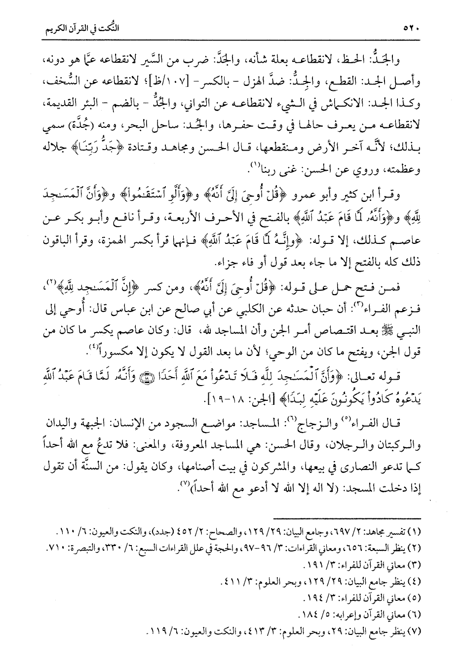 وقرأ ابن كثير وأبو عمرو {قُلْ أُوحِيَ إِلَيَّ أَنَّهُ} و {وَأَلَّوِ اسْتَقَامُوا} و {وَأَنَّ الْمَسَاجِدَ لِلَّهِ} و {وَأَنَّهُ لَمَّا قَامَ عَبْدُ اللَّهِ} بالفتح في الأحرف الأربعة، وقرأ نافع وأبو بكر عن عاصم كذلك، إلا قوله: {وَأَنَّهُ لَمَّا قَامَ عَبْدُ اللَّهِ} فإنها قرأ بكسر الهمزة، وقرأ الباقون ذلك كله بالفتح إلا ما جاء بعد قول أو فاء جزاء.