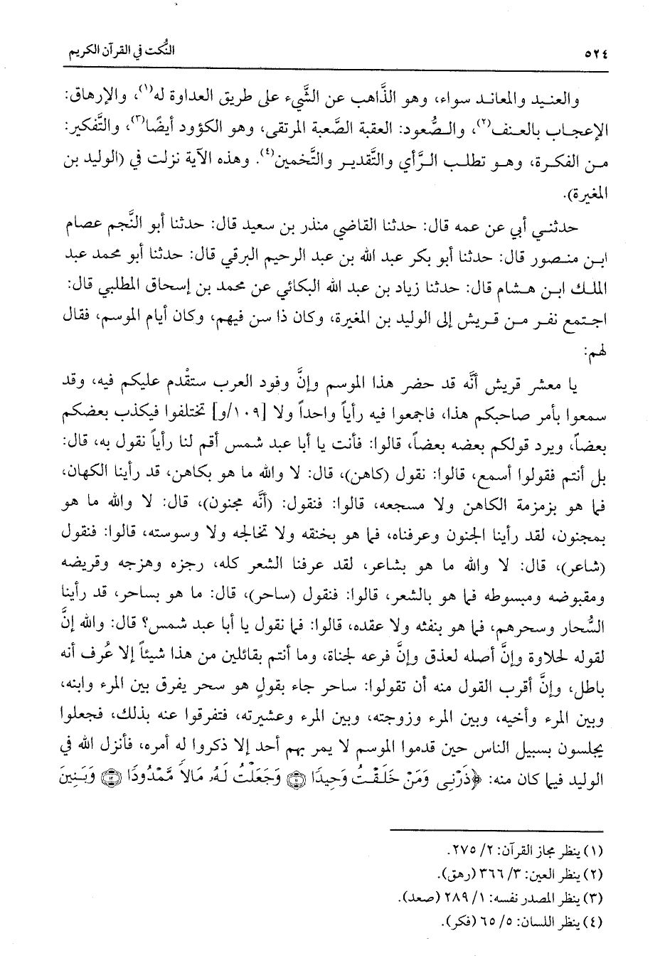 يا معشر قريس أنه قد حضر هذا الموسم وإن وفود العرب ستقدم عليكم فيه، وقد سمعوا بأمر صاحبكم هذا، فاجمعوا فيه رأياً واحداً ولا تختلفوا فيكذب بعضكم بعضاً، ويرد قولكم بعضه بعضاً، قالوا: فأنت يا أبا عبد شمس أقم لنا رأياً نقول به، قال: بل أنتم فقولوا أسمع، قالوا: نقول (كاهن) ، قال: لا والله ما هو بكاهن، قد رأينا الكهان، فما هو بزمزمة الكاهن ولا مسجعه، قالوا: فنقول: (أنه مجنون) ، قال: لا والله ما هو بمجنون، لقد رأينا الجنون وعرفناه، فما هو بخنقه ولا تخالجه ولا وسوسته، قالوا: فنقول (شاعر) ، قال: لا والله ما هو بشاعر، لقد عرفنا الشعر كله، رجزه وهزجه وقريضه ومقبوضه ومبسوطه فما هو بالشعر، قالوا: فنقول (ساحر) ، قال: ما هو بساحر، قد رأينا السحار وسحرهم، فما هو بنفثه ولا عقده، قالوا: فما نقول يا أبا عبد شمس؟ قال: والله إن لقوله لحلاوة وإن أصله لعذق وإن فرعه لجناة، وما أنتم بقائلين من هذا شيئاً إلا عرف أنه باطل، وإن أقرب القول منه أن تقولوا: ساحر جاء بقولٍ هو سحر يفرق بين المرء وابنه، وبين المرء وأخيه، وبين المرء وزوجته، وبين المرء وعشيرته، فتفرقوا بذلك، فجعلوا يجلسون بسبيل الناس حين قدموا الموسم لا يمر بهم أحد إلا ذكروا له أمره، فأنزل الله في الوليد فيما كان منه: {ذَرْنِي وَمَنْ خَلَقْتُ وَحِيدًا (11) وَجَعَلْتُ لَهُ مَالًا مَمْدُودًا (12) وَبَنِينَ