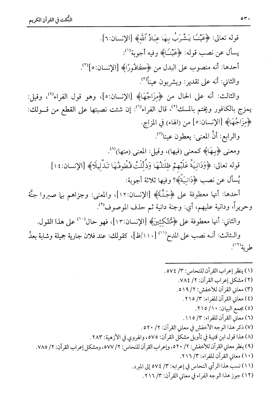 والثالث: أنه على الحال من {مِزَاجُهَا} [الإنسان: 5] ، وهو قول الفراء، وقيل: يمزج بالكافور ويختم بالمسك، قال الفراء: إن شئت نصبتها على القطع من قولك: {مِزَاجُهَا} [الإنسان: 5] من (الهاء) في المزاج.