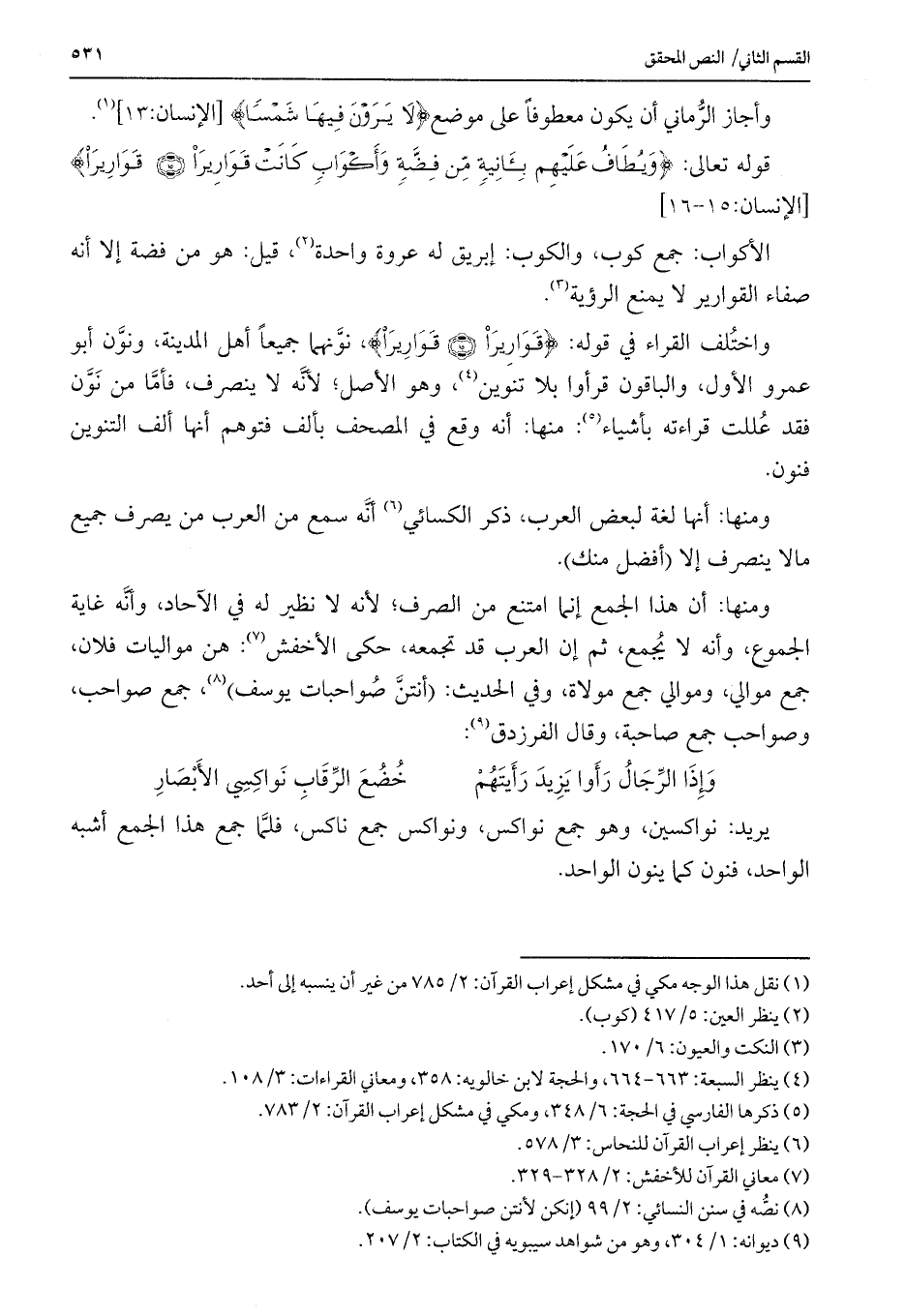 واختلف القراء في قوله: {قَوَارِيرَا (15) قَوَارِيرَ} ، نونهما جميعاً أهل المدينة، ونون أبو عمرو الأول، والباقون قرأوا بلا تنوين، وهو الأصل؛ لأنه لا ينصرف، فأما من نون فقد عللت قراءته بأشياء: منها: أنه وقع في المصحف بألف فتوهم أنها ألف التنوين فنون.