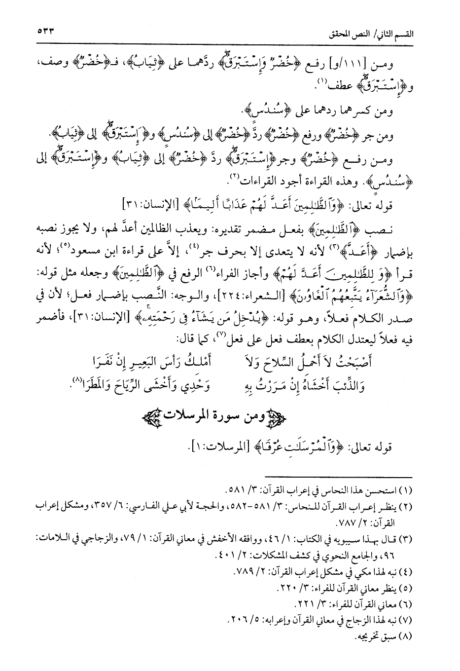 ومن رفع {خُضْرٌ} وجر {إِسْتَبْرَقٌ} رد {خُضْرٌ} إلى {ثِيَابُ} و {إِسْتَبْرَقٌ} إلى {سُنْدُسٍ} . وهذه القراءة أجود القراءات.