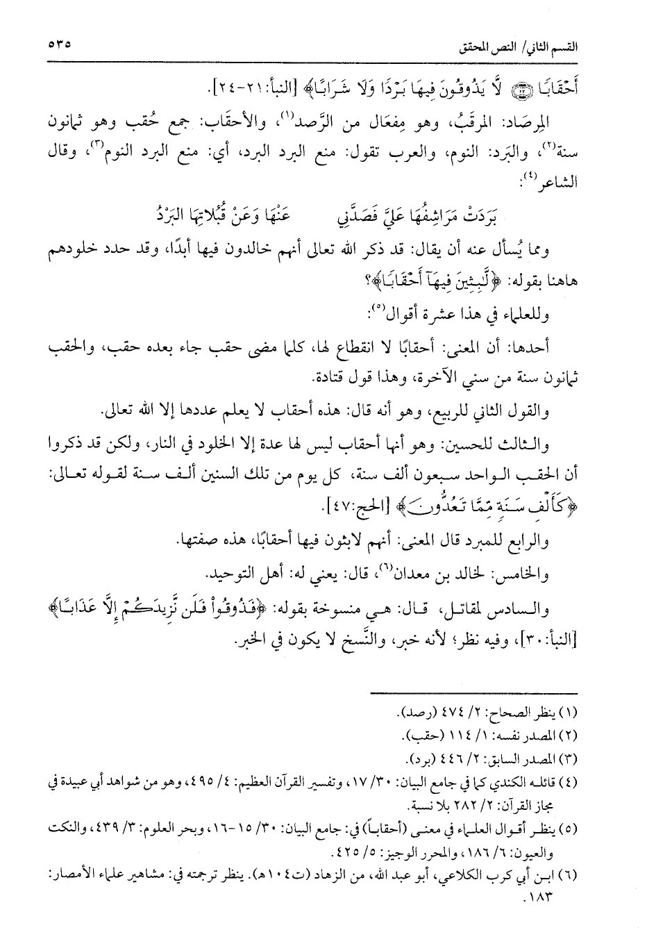 المرصاد: المرقب، وهو مفعال من الرصد، والأحقاب: جمع حقب وهو ثمانون سنة، والبرد: النو، والعرب تقول: منع البرد البرد، أي: منع البرد النوم، وقال الشاعر: