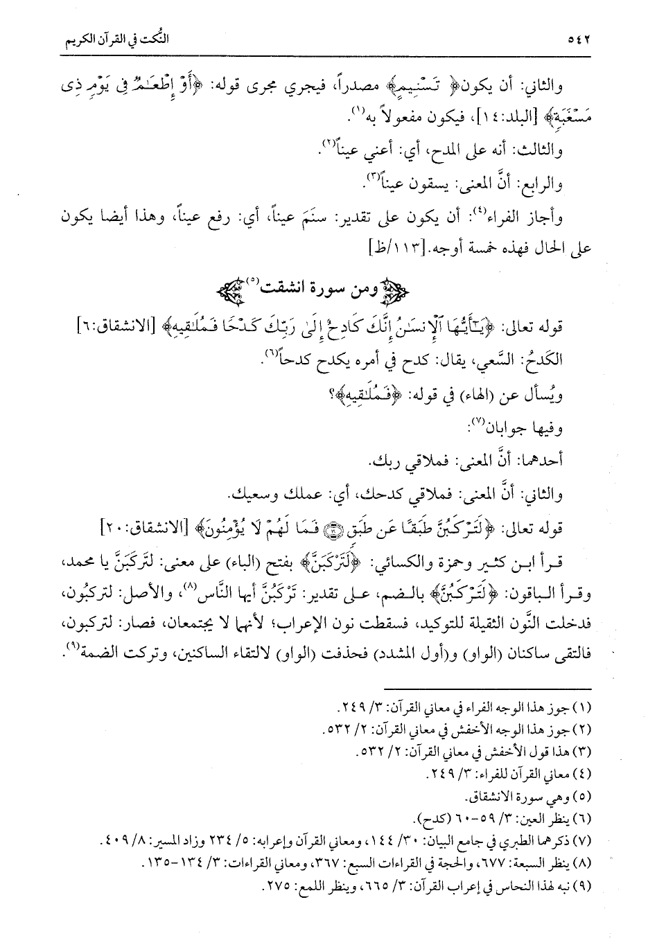 قرأ ابن كثير وحمزة والكسائي: {لَتَرْكَبَنَّ} بفتح (الباء) على معنى: لتركبن يا محمد، وقرأ الباقون: {لَتَرْكَبُنَّ} بالضم، على تقدير: تركبن إيها الناس، والأصل: لتركبون، فدخلت النون للتوكيد، فسقطت نون الإعراب؛ لأنهما لا يجتمعان، فصار: لتركبون، فالتقى ساكنان (الواو) و (أول المشدد) فحذفت (الواو) لالتقاء الساكنين، وتركت الضمة.