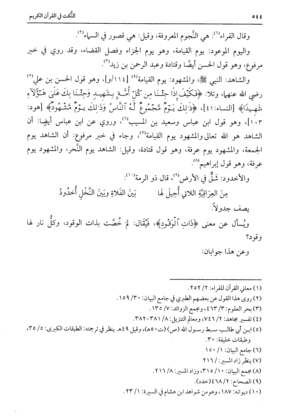 والشاهد: النبي - صلى الله عليه وسلم -، والمشهود: يوم القيامة، وهو قول الحسن بن علي رضي الله عنهما، وتلا: {فَكَيْفَ إِذَا جِئْنَا مِنْ كُلِّ أُمَّةٍ بِشَهِيدٍ وَجِئْنَا بِكَ عَلَى هَؤُلَاءِ شَهِيدًا} [النساء: 41] ، {ذَلِكَ يَوْمٌ مَجْمُوعٌ لَهُ النَّاسُ وَذَلِكَ يَوْمٌ مَشْهُودٌ} [هود: 103] ، وهو قول ابن عباس وسعيد بن المسيب، وروي عن ابن عباس أيضاً: أن الشاهد هو الله تعالى والمشهود يوم القيامة، وجاء في خبر مرفوع: أن الشاهد يوم الجمعة، والمشهود يوم عرفة، وهو قول قتادة، وقيل: الشاهد يوم النحر، والمشهود يوم عرفة، وهو قول إبراهيم.