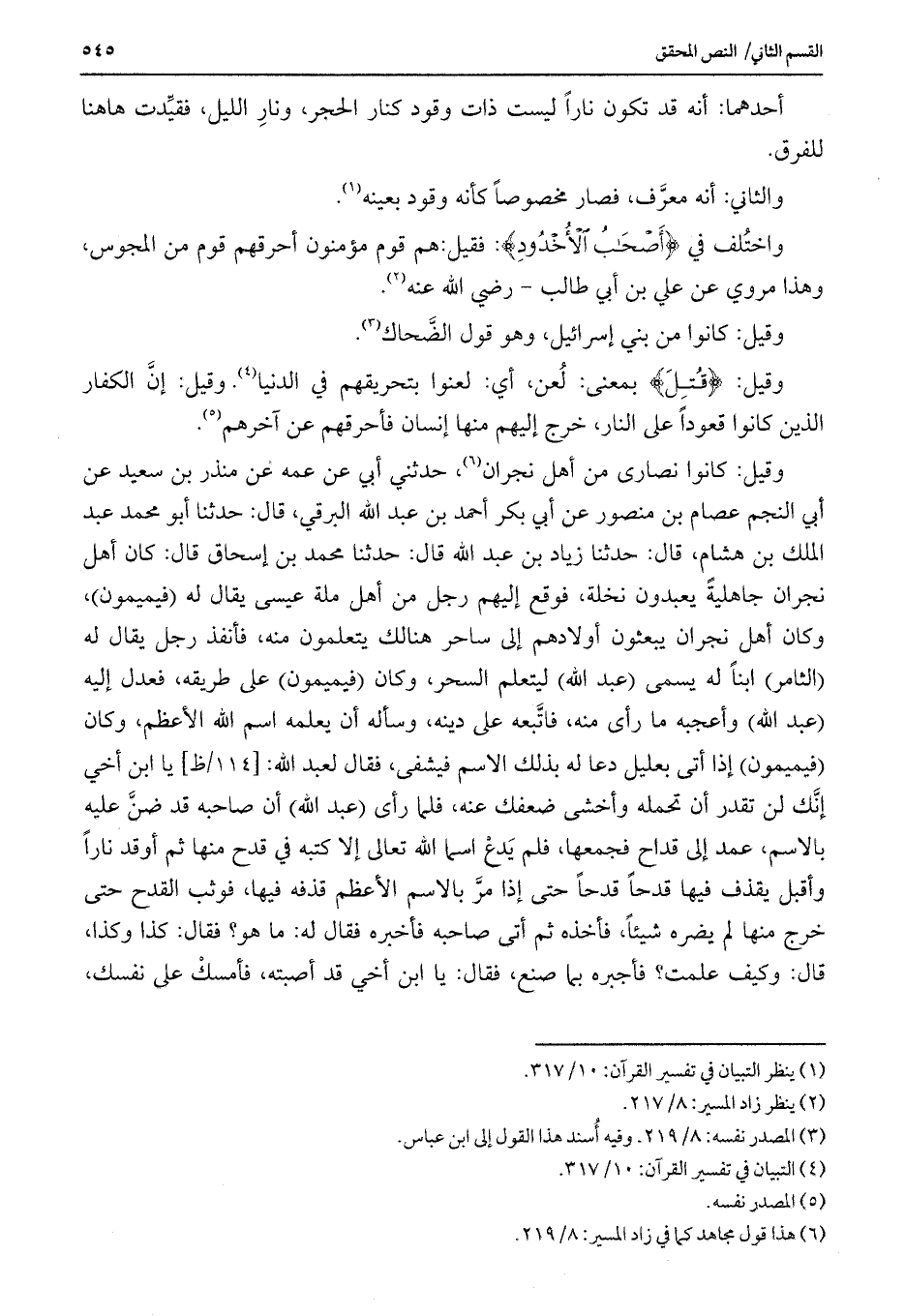 وقيل: كانوا نصارى من أهل نجران، حدثني أبي عن عمه عن منذر بن سعيد عن أبي النجم عصام بن منصور عن أبي بكر أحمد بن عبد الله البرقي، قال: حدثنا أبو محمد عبد الملك بن هشام، قال: حدثنا زياد بن عبد الله قال: حدثنا محمد بن إسحاق قال: كان أ÷ل نجران جاهلية يعبدون نخلة، فوقع إليهم رجل من أهل ملة عيسى يقال له (فيميمون) ، وكان أهل نجران يبعثون أولادهم إلى ساحر هنالك يتعلمون منه، فأنفذ رجل يقال له (الثامر) ابناً له يسمى (عبد الله) ليتعلم السحر، وكان (فيميمون) على طريقه، فعدل إليه (عبد الله) وأعجبه ما رأي منه، فاتبعه على دينه، وسأله أن يعلمه اسم الله الأعظم، وكان (فيميمون) إذا أتى بعليل دعل له بذلك الاسم فيشفى، فقال لعبد الله: يا ابن أخي إنك لن تقدر أن تحمله وأخشى ضعفك عنه، فلما رأى (عبد الله) أن صاحبه قد ضن عليه بالاسم، عمد إلى قداح فجمعها، فلم يدع اسما الله تعالى إلا كتبه في قدح منها ثم أوقد ناراً وأقبل يقذف فيها قدحاً قدحاً حتى إذا مر بالاسم الأعظم قذفه فيها، فوثب القدح حتى خرج منها لم يضره شيئاً، فأخذه ثم أتى صاحبه فأخبره فقال له: ما هو؟ فقال: كذا وكذا، قال: وكيف علمت؟ فأجبره بما صنع، فقال: يا ابن أخي قد أصبته، فأمسك على نفسك،