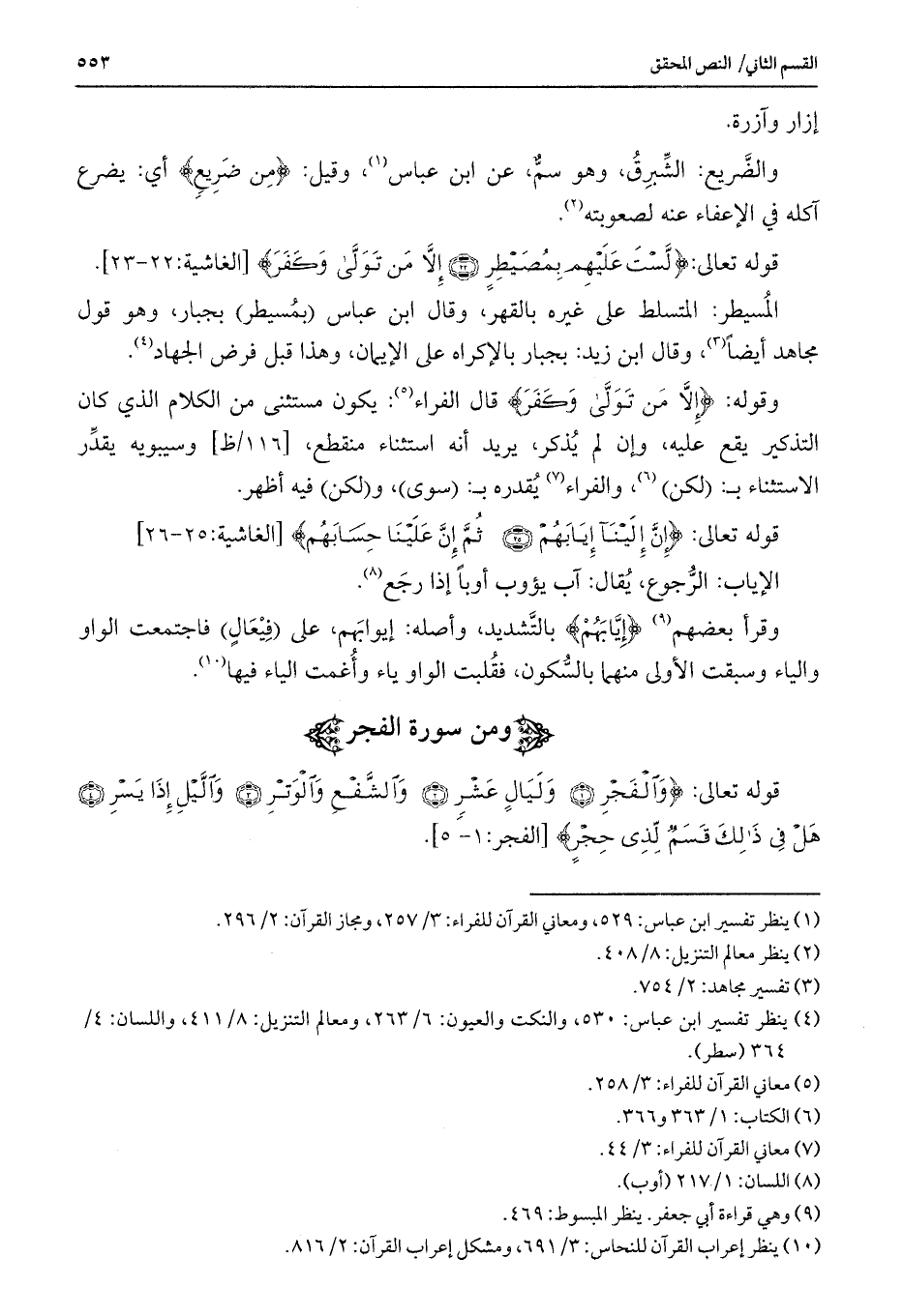 قوله تعالى: {وَالْفَجْرِ (1) وَلَيَالٍ عَشْرٍ (2) وَالشَّفْعِ وَالْوَتْرِ (3) وَاللَّيْلِ إِذَا يَسْرِ (4) هَلْ فِي ذَلِكَ قَسَمٌ لِذِي حِجْرٍ} [الفجر: 1-5] .