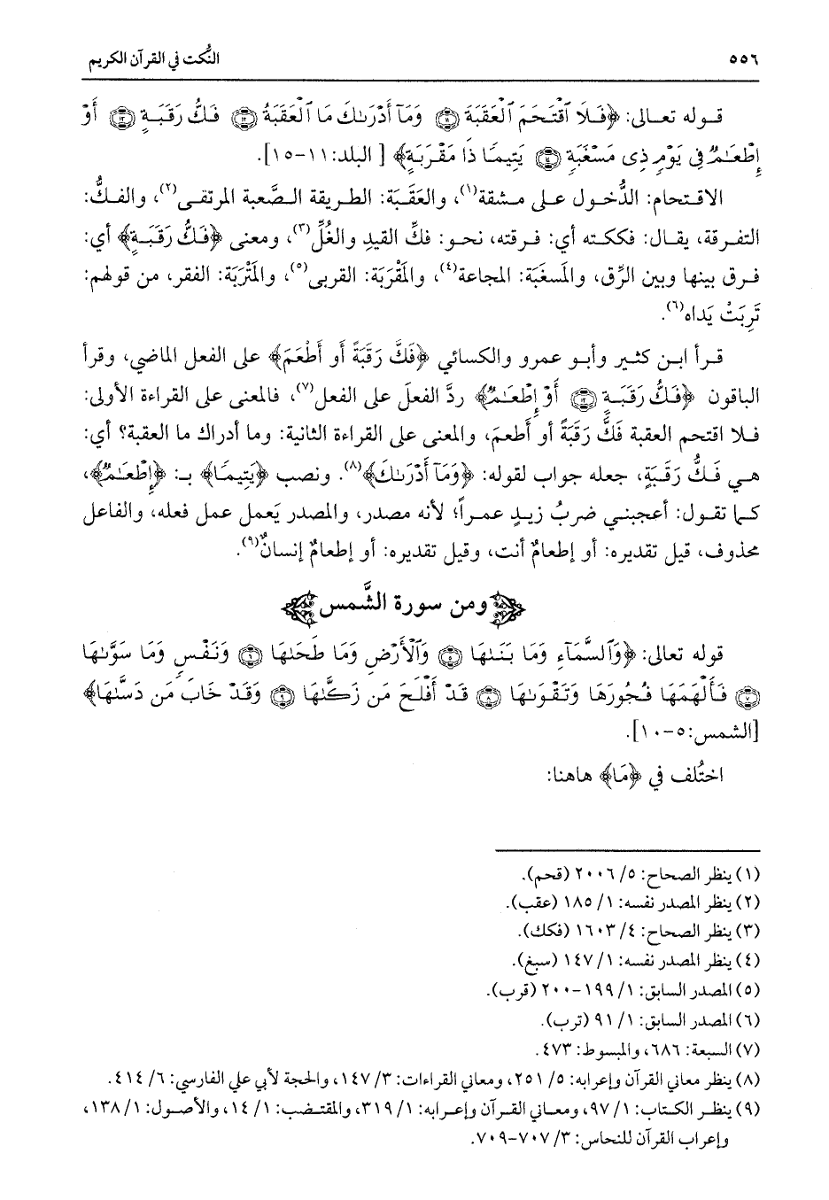 قرأ ابن كثير وأبو عمرو الكسائي {فَكُّ رَقَبَةٍ أَوْ إِطْعَامٌ} على الفعل الماضي، وقرأ الباقون {فَكُّ رَقَبَةٍ (13) أَوْ إِطْعَامٌ} رد الفعل على الفعل، فالمعنى على القراءة الأولى: فلا اقتحم العقبة فك رقبة أو أطعم، والمعنى على القراءة الثانية: وما أدراك ما العقبة؟ أي: هي فك رقبة، جعله جواب لقوله: {وَمَا أَدْرَاكَ} . ونصب {يَتِيمًا} بـ: {إِطْعَامٌ} ، كما تقول: أعجبني ضرب زيد لأنه مصدر، والمصدر يعمل عمل فعله، والفاعل محذوف، قيل تقديره: أو إطعام أنت، وقيل تقديره: أو إطعام إنسان.