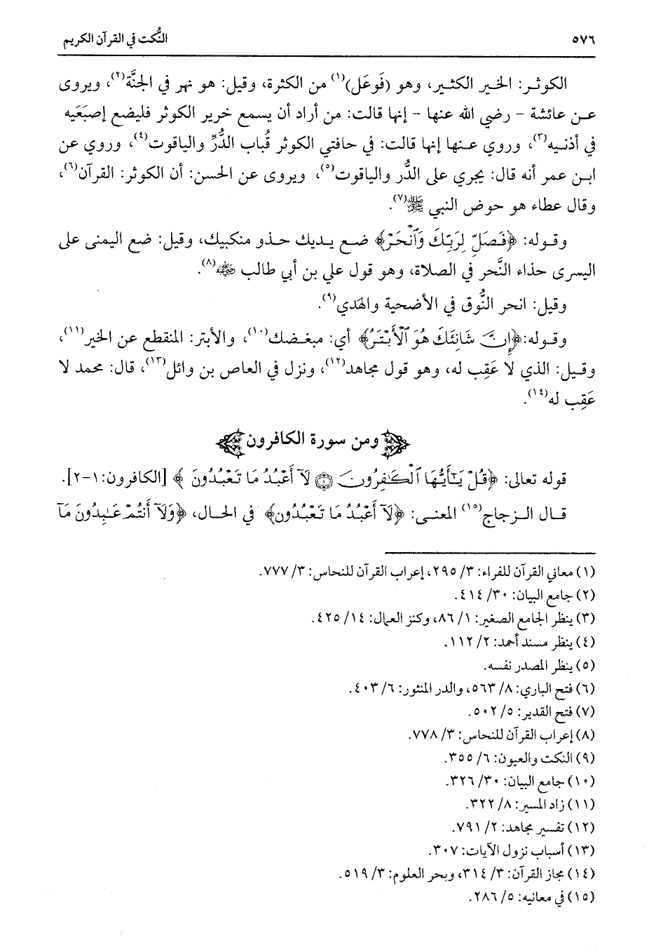 الكوثر: الخير الكثير، وهو (فَوعَل) من الكثرة، وقيل: هو نهر في الجنة، ويروى عن عائشة - رضي الله عنها - إنها قالت: من أراد أن يسمع خرير الكوثر فليضع إصبعيه في أذنيه، وروي عنها إنها قالت: في حافتي الكوثر قباب الدر والياقوت، وروي عن ابن عمر أنه قال: يجري على الدر والياقوت، ويروى عن الحسن: أن الكوثر: القرآن، وقال عطاء هو حوض النبي - صلى الله عليه وسلم -.
