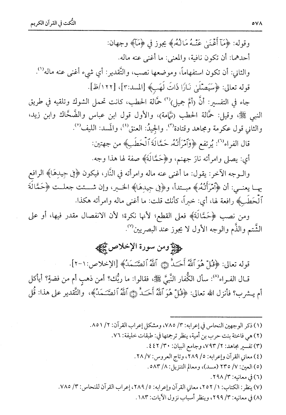 والوجه الآخر: يقول: ما أغنى عنه ماله وامرأته في النار، فيكون {فِي جِيدِهَا} الرافع بها يعني: أن {امْرَأَتُهُ} مبتدأ، و {فِي جِيدِهَا} الخبر، وإن شئت جعلت {حَمَّالَةَ الْحَطَبِ} رافعة لها، أي: خبراً، كأنك قلت: ما أغنى ماله وامرأته هكذا.