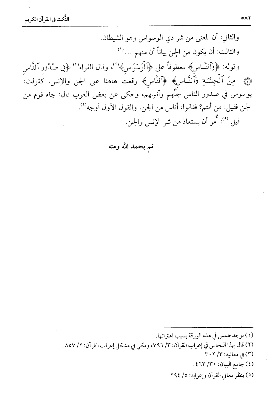 وقوله تعالى: {النَّاسِ} معطوفاً على {الْوَسْوَاسِ} ، وقال الفراء {فِي صُدُورِ النَّاسِ (5) مِنَ الْجِنَّةِ وَالنَّاسِ} {النَّاسِ} وقعت هاهنا على الجن والإنس، كقولك: يوسوس في صدور الناس جهنم وانسهم، وحكى عن بعض العرب قال: جاء قوم من الجن فقيل: من أنتم؟ فقالوا: أناس من الجن، والقول الأول أوجه.