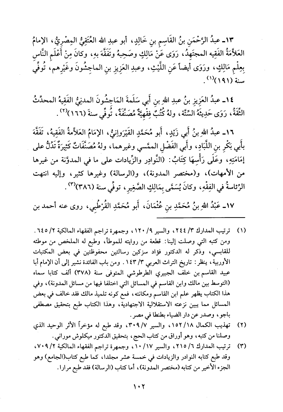 (¬3) ترتيب المدارك 6/ 215، والسير 17/ 10، وجمهرة تراجم الفقهاء المالكية 2/ 709، وقد طبع كتابه النوادر والزيادات في خمسة عشر مجلدا، كما طبع كتاب (الجامع) وهو الجزء الأخير من كتابه (مختصر المدونة)، أما كتاب (الرسالة) فقد طبع مرارا.