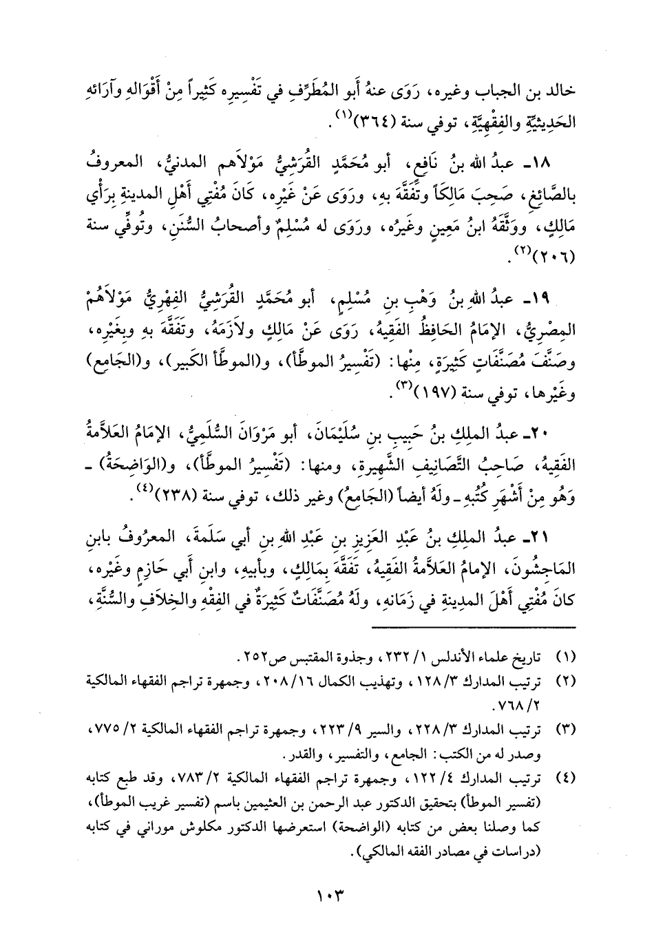 20 - عبدُ الملِكِ بنُ حَبيبِ بنِ سُلَيْمَانَ، أبو مَرْوَانَ السُّلَمِيُّ، الإمَامُ العَلَّامةُ الفَقِيهُ، صَاحِبُ التَّصَانِيفِ الشَّهِيرةِ، ومنها: (تَفْسِيرُ الموطَّأ)، و (الوَاضِحَةُ) - وَهُو مِنْ أَشْهَرِ كُتُبهِ- ولَهُ أيضًا (الجَامِعُ) وغير ذلك، توفي سنة (238) (¬4).