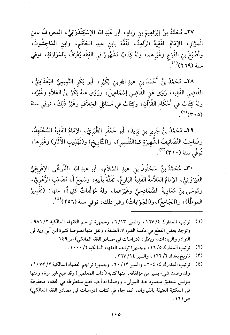 27 - مُحَمَّدُ بنُ إبْرَاهِيمَ بنِ زِيادٍ، أبو عَبْدِ الله الإسْكِنْدَرَانِيُّ، المعروفُ بابنِ الَموَّازِ، الإمَامُ الفَقِيهُ الزَّاهِدُ، تَفَقَّهَ بابنِ عبدِ الحَكَمِ، وابنِ المَاجِشُونَ، وأَصْبَغَ بنِ الفَرَجِ وغَيْرِهم، ولهُ كِتَابٌ مَشْهُورٌ في الفِقْه يُعْرَفُ بالمَوَازيِّةِ، توفي سنة (269) (¬1).