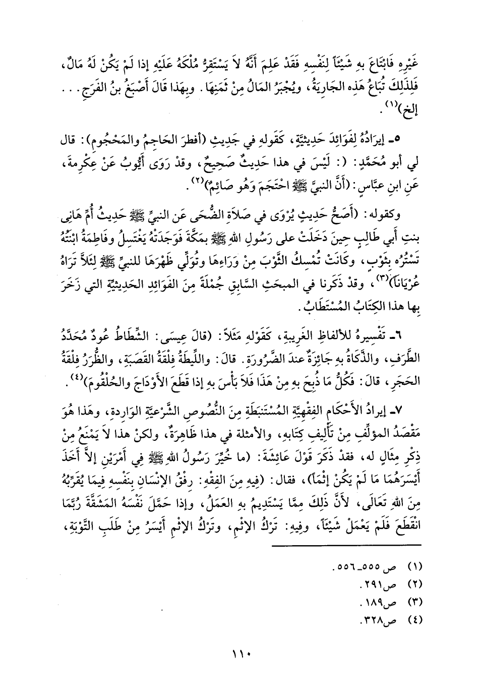 وكقوله: (أَصَحُّ حَدِيثٍ يُرْوَى في صَلاَةِ الضُّحَى عَن النبيِّ - صلى الله عليه وسلم - حدِيثُ أُمِّ هَانِى بنتِ أَبي طَالِبٍ حِينَ دَخَلَتْ على رَسُولِ اللهِ - صلى الله عليه وسلم - بمَكَّةَ فَوَجَدَتْهُ يَغْتَسِلُ وفَاطِمَةُ ابْنَتُهُ تَسْتُرُه بثَوْبٍ، وكَانَتْ تُمْسِكُ الثَّوْبَ مِنْ وَرَاءِهَا وتُوَلِّي ظَهْرَهَا للنبيِّ - صلى الله عليه وسلم - لِئَلَّا تَرَاهُ عُرْيَانًا) (¬3)، "وقدْ ذَكَرنا في المبحَثِ السَّابِقِ جُمْلَةً مِنَ الفَوَائِدِ الحَدِيثيِّةِ التي زَخَرَ بِها هذا الكِتَابُ المُسْتَطَابُ.