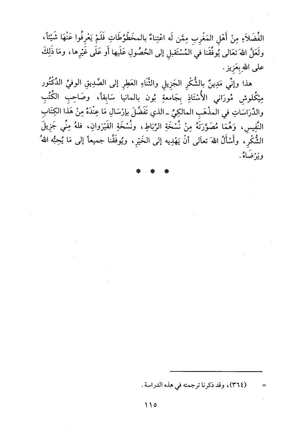 هذا وإنِّي مَدِين بالشُّكْرِ الجَزِيلِ والثَّناءِ العَطِرِ إلى الصَّدِيقِ الوفيِّ الدِّكْتُور مِيْكُلوشِ مُورَاني الأُسْتَاذِ بِجَامعةِ بُون بألمانيا سَابِقًا، وصَاحِبِ الكُتُبِ والدِّرَاسَاتِ في المذْهَبِ المالكِيِّ- الذي تَفَضَّلَ بإرْسَالِ مَا عِنْدَهُ مِنْ هَذا الكِتَابِ النَّفِيسِ، وَهُمَا مُصَوَّرَتَهُ مِنْ نُسْخَةِ الرِّبَاطِ، ونُسْخَةِ القَيْرَوانِ، فلهُ مِنِّي جَزِيلَ الشُّكْرِ، وأَسْأَلُ اللهَ تعاَلى أنْ يَهْدِيه إلى الخَيْرِ، ويُوفَقَّنا جميعًا إلى مَا يُحِبُّه اللهُ ويَرْضَاهُ.
