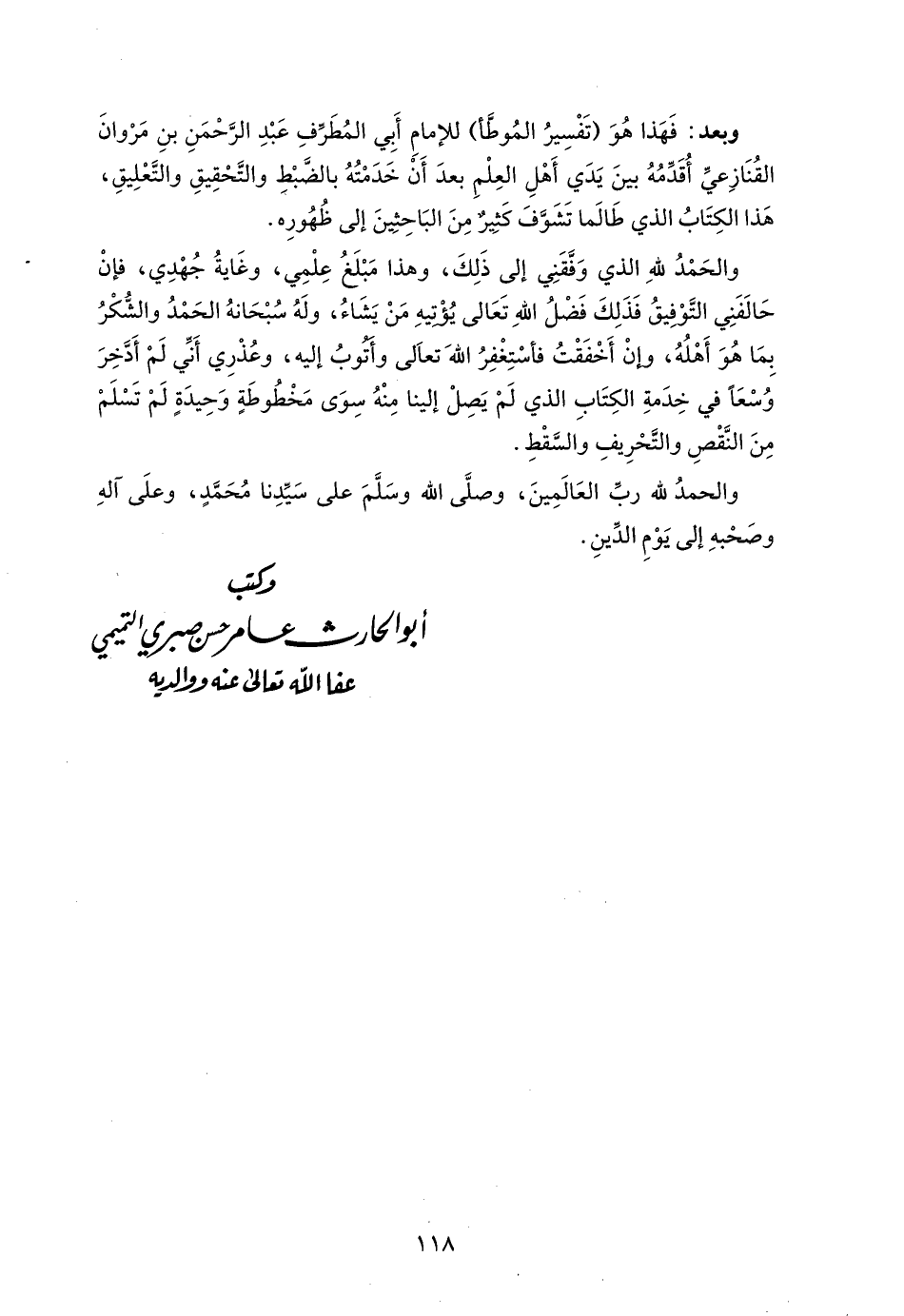 وبعد: فَهَذا هُوَ (تَفْسِيرُ المُوطَّأ) للإمامِ أَبِي المُطَرِّفِ عَبْدِ الرَّحْمَنِ بنِ مَرْوانَ القُنَازِعيِّ أُقَدِّمُهُ بينَ يَدَي أَهْلِ العِلْمِ بعدَ أَنْ خَدَمْتُهُ بالضَّبْطِ والتَّحْقِيقِ والتَّعْلِيقِ، هَذا الكِتَابُ الذي طَالَما تَشَوَّفَ كَثيرٌ مِنَ البَاحِثينَ إلى ظُهُورِه.