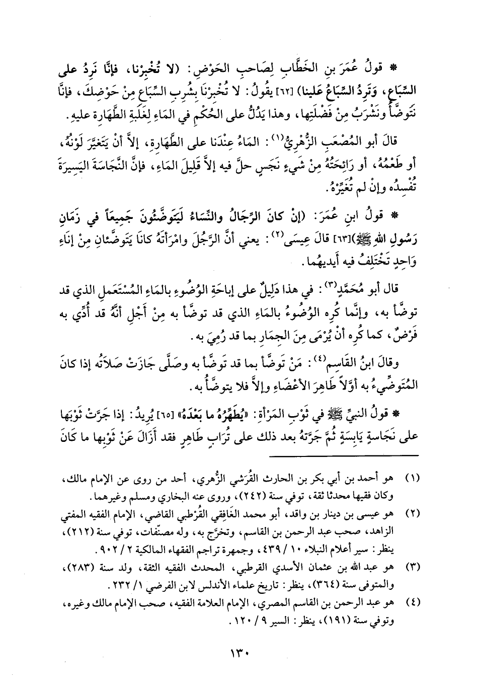 * قولُ عُمَرَ بنِ الخَطَّابِ لِصَاحبِ الحَوْضِ: (لا تُخْبِرْنا، فإنَّا نَرِدُ على السِّبَاع، وَتَرِدُ السِّبَاعُ عَلينا) [62] يقُولُ: لا تُخْبِرْنَا بِشُرِبِ السِّبَاع مِنْ حَوْضِكَ، فإنَّا نتَوضَّأ ونشرَبُ مِنْ فَضْلَتِها، وهذا يَدُلُّ على الحُكْمِ في المَاءِ لِغَلَبةِ الطَّهَارِة عليهِ.