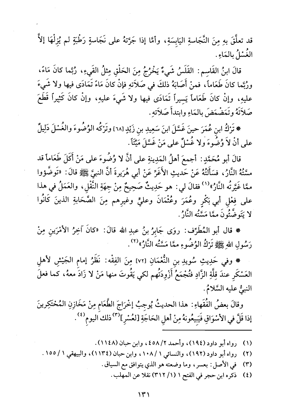 * قال أبو المُطَرِّف: روَى جَابِرُ بنُ عبدِ الله قالَ: "كانَ آخِرُ الأمْرَينِ مِنْ رَسُولِ اللهِ - صلى الله عليه وسلم - تَرْكُ الوُضُوءِ مما مَسَّتُه النَّارُ" (¬2).