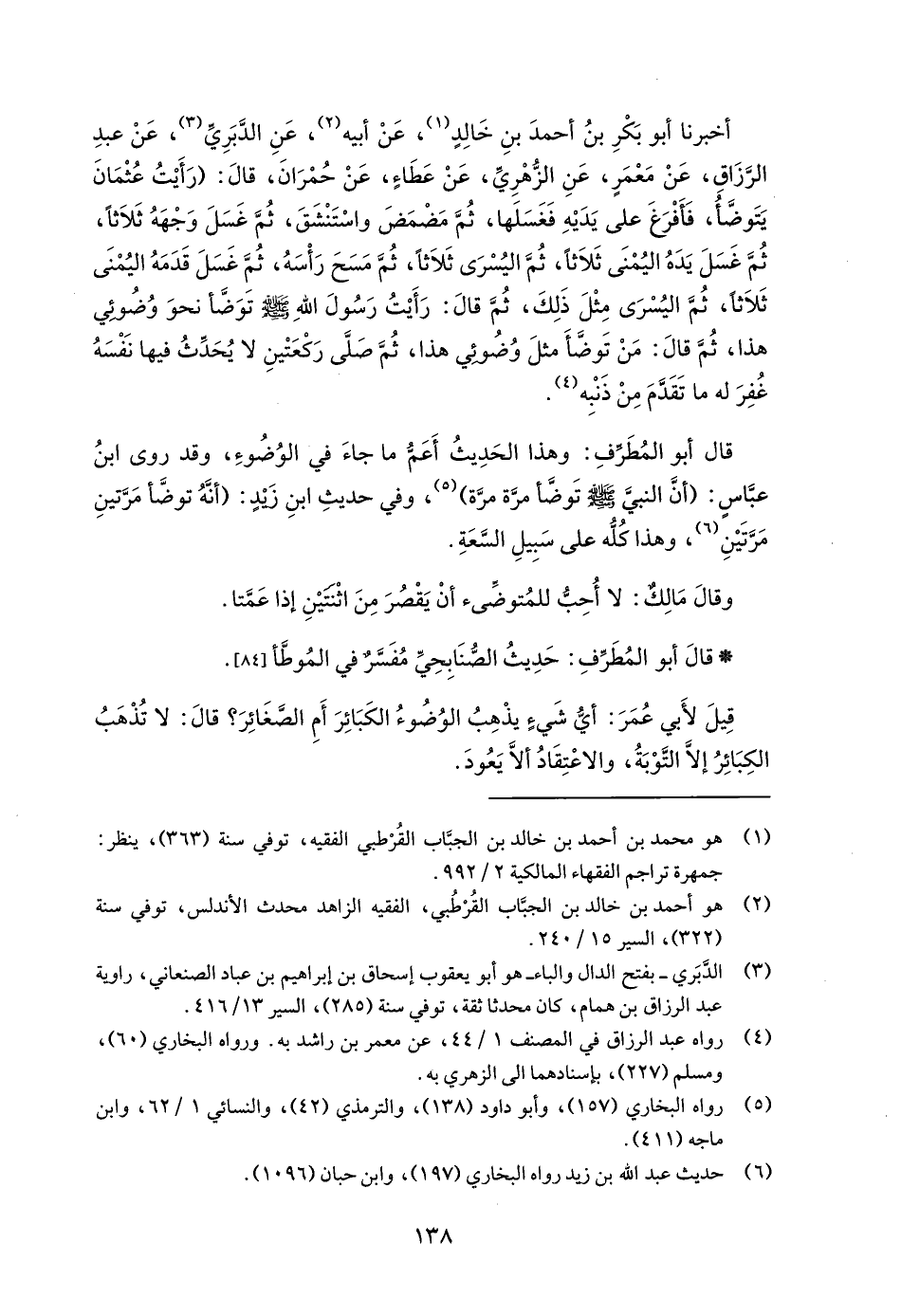 قِيلَ لأَبي عُمَرَ: أيُّ شَيءٍ يذْهِبُ الوُضُوءُ الكَبَائِرَ أَمِ الصَّغَائِرَ؟ قالَ: لا تُذْهَبُ الكِبَائِرُ إلا التَّوْبَةُ، والإعْتِقَادُ ألَّا يَعُودَ.