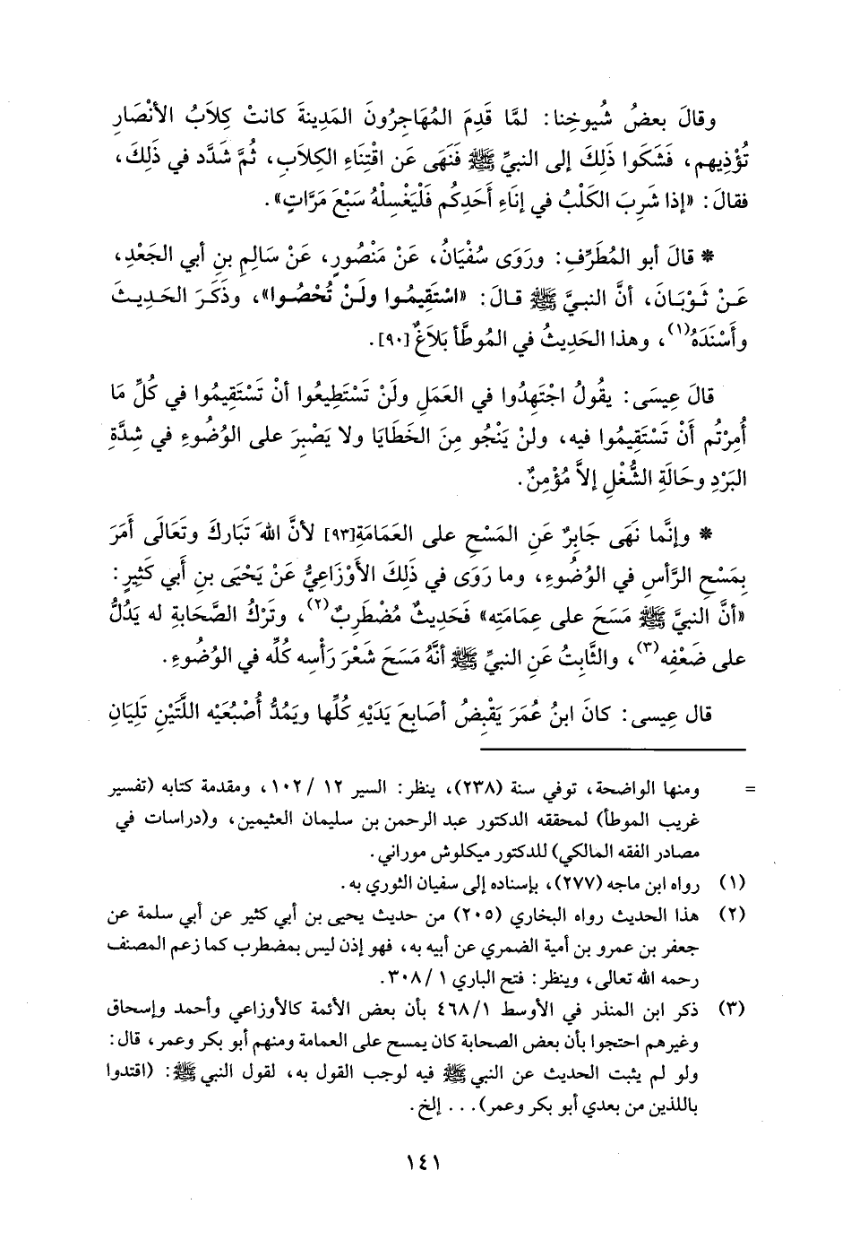 * وإنما نَهَى جَابِرٌ عَنِ المَسْحِ على العَمَامَةِ [93]، لأن اللهَ تَبَاركَ وتَعَالَى أَمَرَ بِمَسْحِ الرَّأسِ في الوُضُوءِ، وما رَوَى في ذَلِكَ الأَوْزَاعِيُّ عَنْ يحيى بنِ أَبي كَثِيرٍ: "أنَّ النبيَّ - صلى الله عليه وسلم - مسَحَ على عِمَامَتِه" فَحَدِيثٌ مُضْطَرِبٌ (¬2)، وتَرْكُ الصَّحَابةِ له يَدُلُّ على ضَعْفِه (¬3)، والثَّابِتُ عَنِ النبيِّ - صلى الله عليه وسلم - أنَّهُ مَسَحَ شَعْرَ رَأْسِه كُلِّه في الوُضُوءِ.