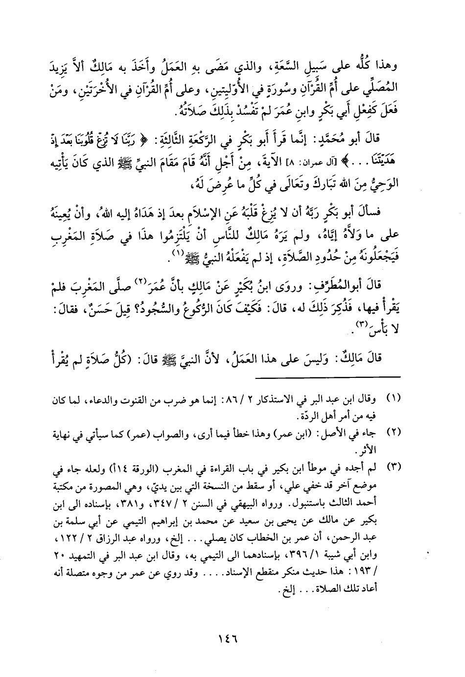 وهذا كُلُّه على سَبيلِ السَّعَةِ، والذي مَضَى بهِ العَمَلُ وأَخَذَ به مَالِكٌ ألَّا يَزِيدَ المُصَلِّي على أُمِّ القُرْآنِ وسُورَةٍ في الأُوّليِتينِ، وعلى أُمِّ القُرْآنِ في الأُخْرَتَيْنِ، ومَنْ فَعَلَ كَفِعْلِ أَبي بَكْرٍ وابنِ عُمَرَ لمْ تَفْسُدْ بِذَلِكَ صَلَاتُهُ.