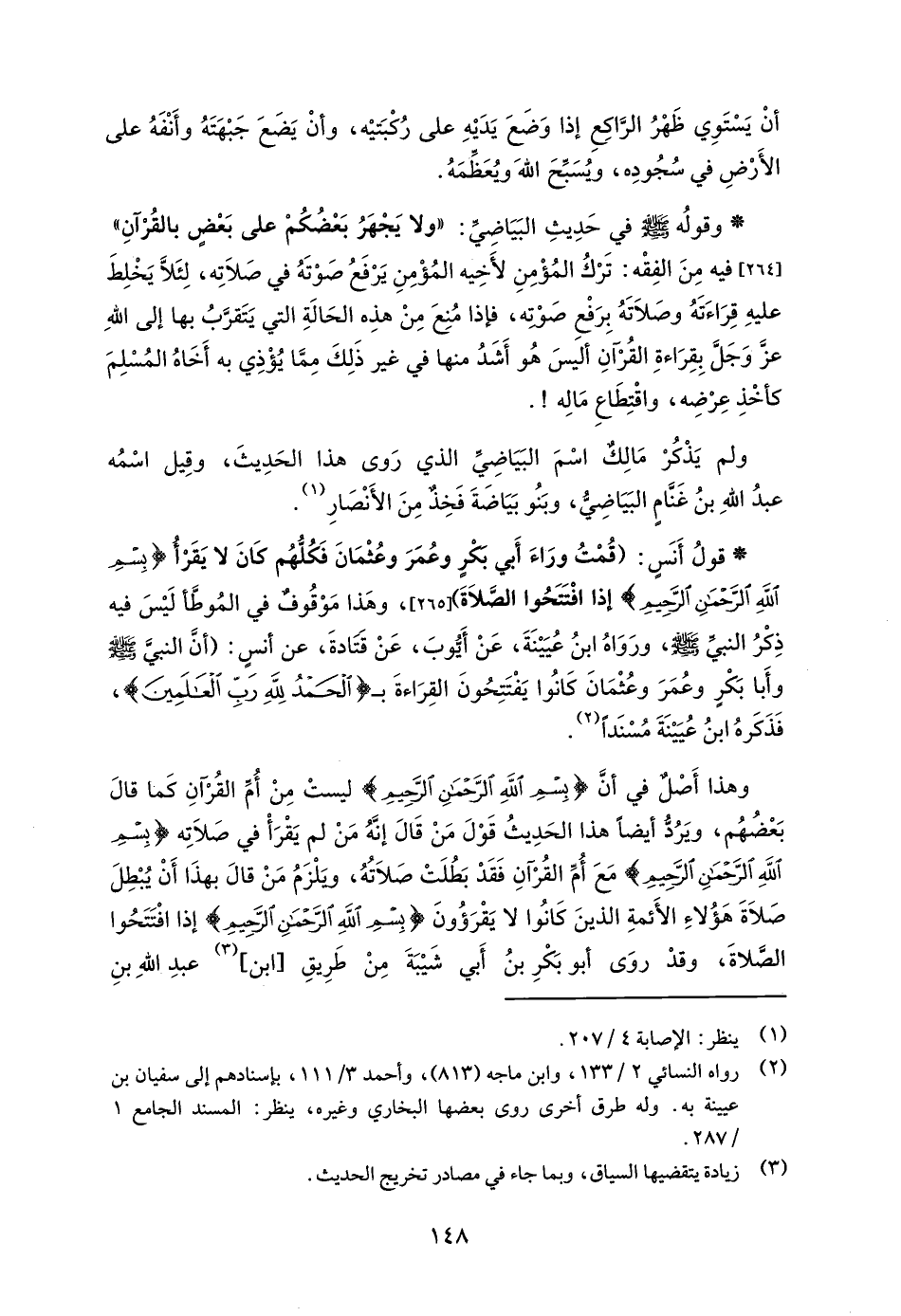 وهذا أَصْلٌ في أنَّ {بِسْمِ اللَّهِ الرَّحْمَنِ الرَّحِيمِ} ليستْ مِنْ أُمِّ القُرْآنِ كَما قالَ بَعْضُهُم، ويَرُدُّ أيضًا هذا الحَدِيثُ قَوْلَ مَنْ قَالَ إنَّهُ مَنْ لم يَقْرَأْ في صَلَاتِه {بِسْمِ اللَّهِ الرَّحْمَنِ الرَّحِيمِ} مَعَ أُمِّ القُرْآنِ فَقَدْ بَطُلَتْ صَلَاتُهُ، ويَلْزَمُ مَنْ قالَ بهذَا أَنْ يُبْطِلَ صَلَاةَ هَؤُلاءِ الأَئمةِ الذينَ كَانُوا لا يَقْرَؤُونَ {بِسْمِ اللَّهِ الرَّحْمَنِ الرَّحِيمِ} إذا افْتَتَحُوا الصَّلاةَ، وقدْ روَى أبو بَكْرِ بنُ أَبي شَيْبَةَ مِنْ طَرِيقِ [ابن] (¬3) عبدِ اللهِ بنِ