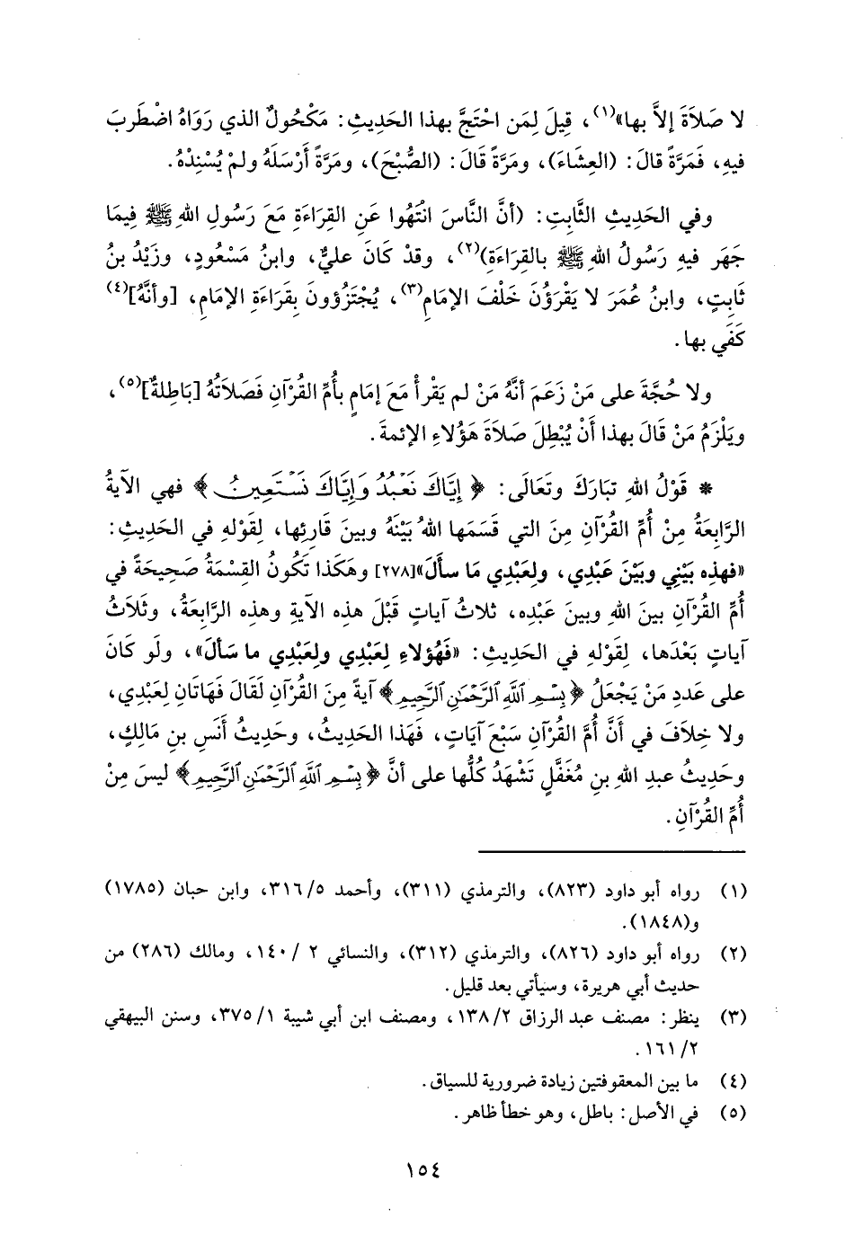 لا صَلاَةَ إلا بها" (¬1)، قِيلَ لِمَن احْتَجَّ بهذا الحَدِيثِ: مَكْحُولٌ الذي رَوَاهُ اضْطَربَ فيهِ، فَمَرَّةً قالَ: (العِشَاءَ)، ومَرَّةً قَالَ: (الصُّبْحَ)، ومَرَّةً أَرْسَلَهُ ولمْ يُسْنِدْهُ.