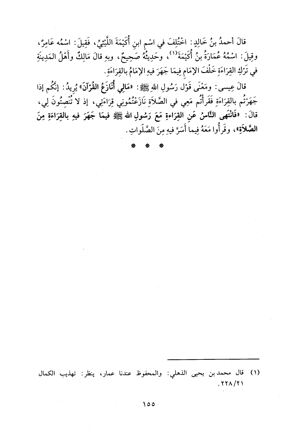 قالَ أحمدُ بنُ خَالِدٍ: اخْتُلِفَ في اسْمِ ابنِ أُكَيْمَةَ اللَّيْثِيِّ، فَقِيلَ: اسْمُه عَامِرٌ، وقِيلَ: اسْمُهُ عُمَارَةُ بنُ أُكَيْمَةَ (¬1)، وحَدِيثُهُ صَحِيحٌ، وبهِ قالَ مَالِكٌ وأَهْلُ المَدِينَةِ في تَرْكِ القِرَاءَةِ خَلْفَ الإمَامِ فِيمَا جَهَرَ فيهِ الإمَامُ بالقِرَاءَةِ.
