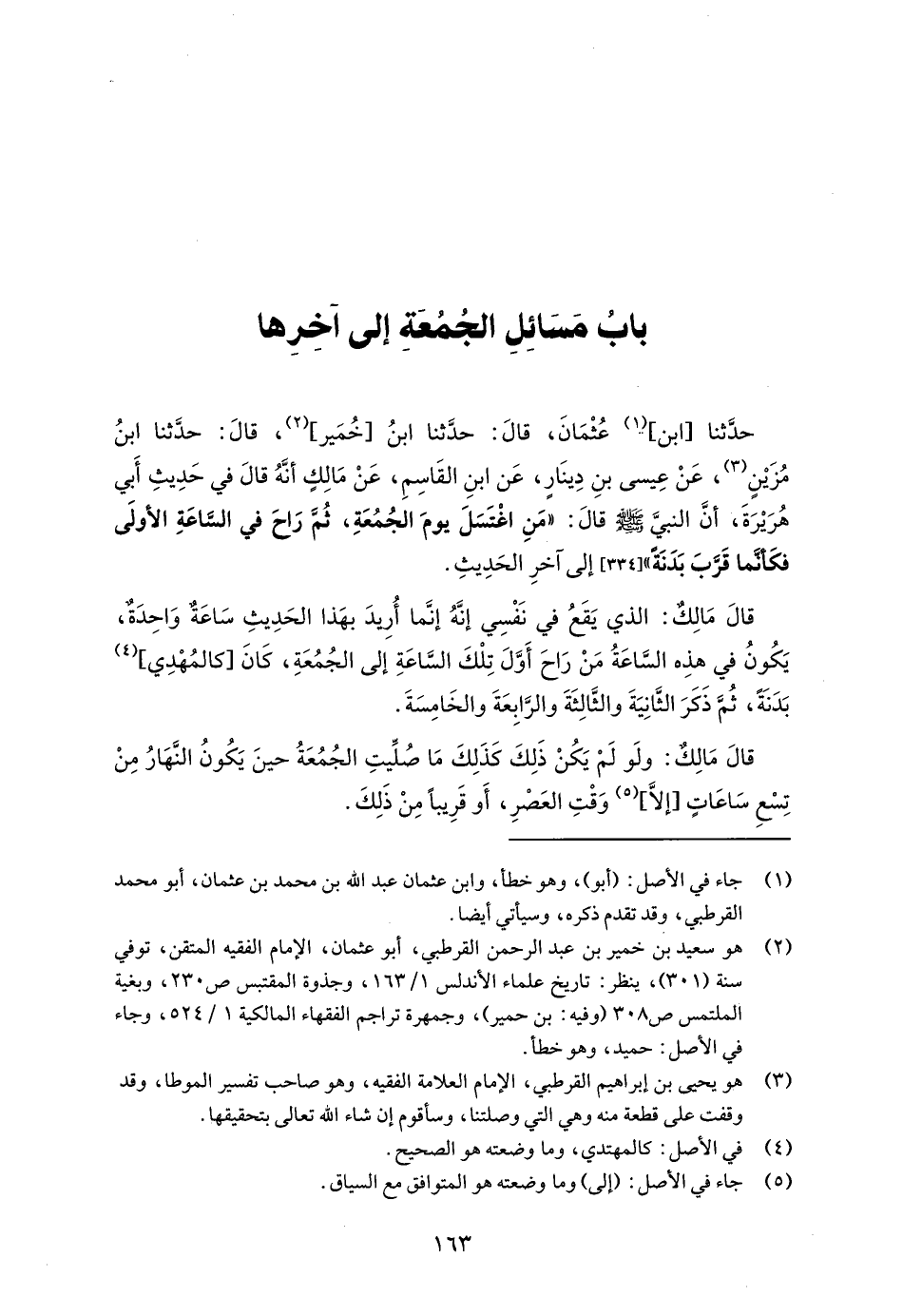 حدَّثنا [ابن] (¬1) عُثْمَانَ، قالَ: حدَّثنا ابنُ [خُمَير] (¬2)، قالَ: حدَّثنا ابنُ مُزَيْنٍ (¬3)، عَنْ عِيسى بنِ دِينَارٍ، عَن ابنِ القَاسِمِ، عَنْ مَالِكٍ أنَّهُ قالَ في حَدِيثِ أَبي هُرَيْرَةَ، أنَّ النبيَّ - صلى الله عليه وسلم - قالَ: "مَنِ اغْتَسَلَ يومَ الجُمُعَةِ، ثُمَ رَاحَ في السَّاعَةِ الأولَى فكَانَّما قَرَّبَ بَدَنَةً" إلى آخرِ الحَدِيثِ.
