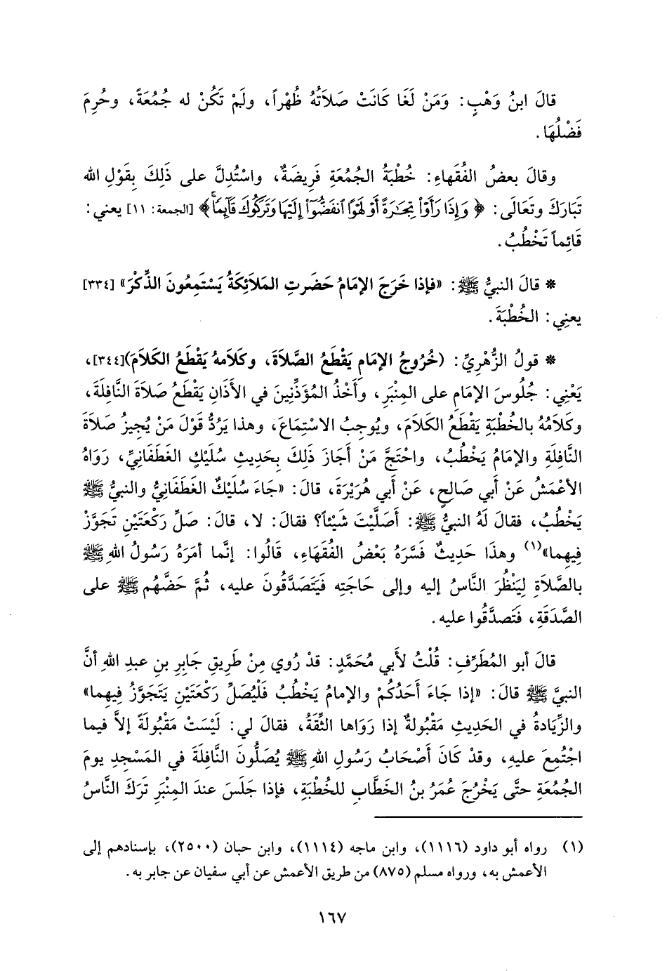 * قولُ الزُّهْرِيِّ: (خُرُوجُ الإمَامِ يَقْطَعُ الصَّلاَةَ، وكَلاَمهُ يَقْطَعُ الكَلاَمَ) يَعْنِي: جُلُوسَ الإمَامِ على المِنْبَرِ، وأَخْذُ المُؤَذِّنِينَ في الأَذَانِ يَقْطَعُ صَلاَةَ النَّافِلَةَ، وكَلاَمُهُ بالخُطْبَةِ يَقْطَعُ الكَلاَمَ، ويُوجِبُ الإسْتِمَاعَ، وهذا يَرُدُّ قَوْلَ مَنْ يُجِيزُ صَلاَةَ النَّافِلَةِ والإمَامُ يَخْطُبُ، واحْتَجَّ مَنْ أَجَازَ ذَلِكَ بِحَدِيثِ سُلَيْكٍ الغَطَفَانِيِّ، رَوَاهُ الأعْمَشُ عَنْ أَبي صالِحٍ، عَنْ أَبي هُرَيْرَةَ، قالَ: "جَاءَ سُلَيْكٌ الغَطَفَانِيُّ والنبيُّ - صلى الله عليه وسلم - يَخْطُبُ، فقالَ لَهُ النبيُّ - صلى الله عليه وسلم -: أَصَلَّيْتَ شَيْئًا؟ فقالَ: لا، قالَ: صَلِّ رَكْعَتَيْنِ تَجَوَّزْ فِيهِما" (¬1) وهذَا حَدِيثٌ فَسَّرَهُ بَعْضُ الفُقَهَاءِ، قَالُوا: إنَّما أمَرَهُ رَسُولُ اللهِ - صلى الله عليه وسلم - بالصَّلَاةِ لِيَنْظُرَ النَّاسُ إليه وإلى حَاجَتِه فَيَتَصَدَّقُونَ عليه، ثُمَّ حَضَّهُم - صلى الله عليه وسلم -على الصَّدَقَةِ، فَتَصدَّقُوا عليه.