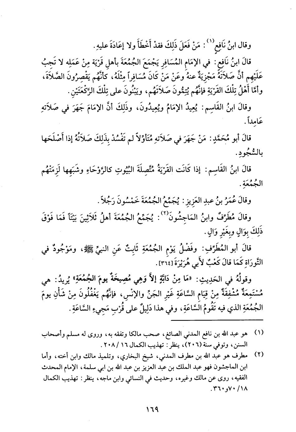 قالَ ابنُ نَافِعٍ: في الإمَامِ المُسَافِرِ يَجْمَعَ الجُمُعَةَ بأهلِ قَرْيَة مِنْ عَمَلِه لا تَجِبُ عَلَيْهِم أنَّ صَلاَتَهُ مَجْزِيَةٌ عنهُ وعَنْ مَنْ كَانَ مُسَافِرًا مِثْلَهُ، كأنَّهُم يَقْصِرُونَ الصَّلاَةَ، وأما أَهْلُ تِلْكَ القَرْيَةِ فإنَّهُم يُتِمُّونَ صَلاَتَهُم، ويَبْنُونَ على تِلْكَ الرَّكْعَتَيْنِ.
