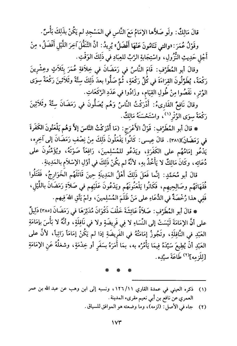 وقالَ أبو المُطَرِّفِ: قَامَ النَّاسُ في رَمَضَانَ في خِلاَفةِ عُمَرَ بِثَلاَثٍ وعِشْرِينَ رَكْعَةً، يُطَوِّلُونَ القِرَاءَةَ في كُلِّ رَكْعَةٍ، ثُمَّ صَلُّوا بعدَ ذَلِكَ سِتَّةً وثَلاَثينَ رَكعَةً سِوَى الوُترِ، نَقَصُوا مِنْ طُولِ القِيَامِ، وزَادُوا في عَدَدِ الرَّكَعَاتِ.
