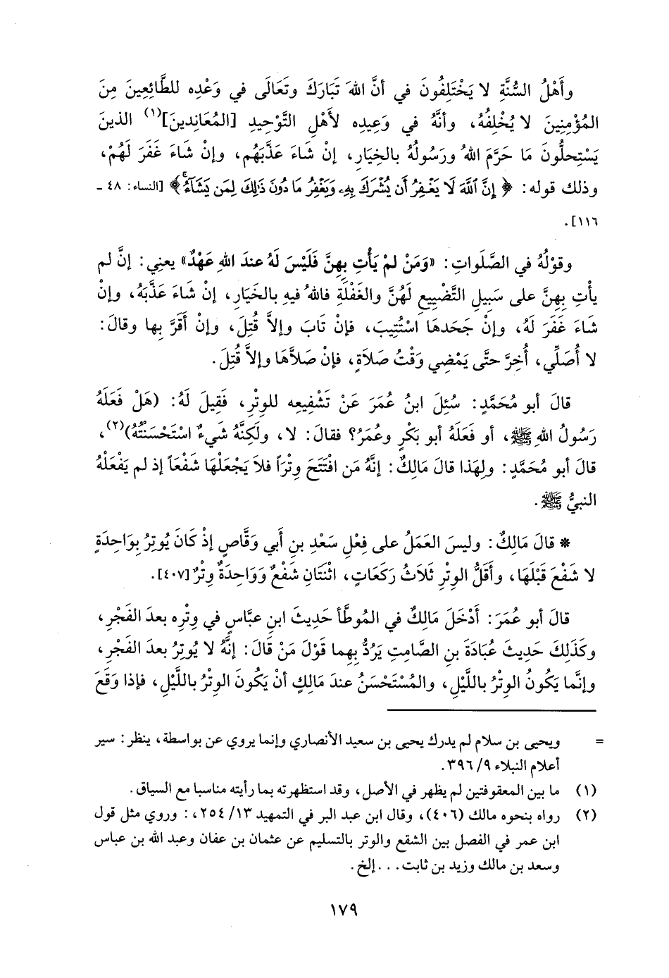 (¬2) رواه بنحوه مالك (406)، وقال ابن عبد البر في التمهيد 13/ 254,: وروي مثل قول ابن عمر في الفصل بين الشفع والوتر بالتسليم عن عثمان بن عفان وعبد الله بن عباس وسعد بن مالك وزيد بن ثابت ... إلخ.