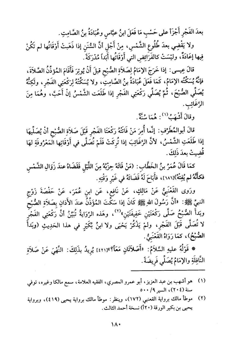 قالَ أبوالمُطَرِّفِ: إنَّما أُمِرَ مَنْ فَاتَتْهُ رَكْعَتَا الفَجْرِ قَبْلَ صَلاَةِ الصُّبْحِ أنْ يُصَلِّيهَا إذا طَلَعَتِ الشَّمْسُ؛ لأن الرَّغَائِبَ إذا تُرِكَتْ فَلَمْ تُصَلَّى في أَوْقَاتِها المَعْرُوفَةِ لهَا قُضِيتْ بعدَ ذَلِكَ.