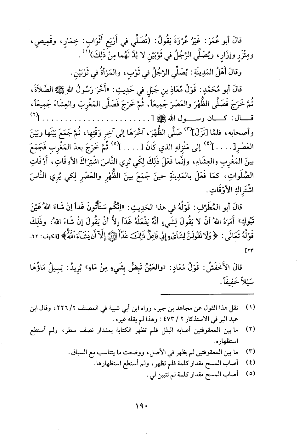 قالَ أبو مُحَمَّد: قَوْلُ مُعَاذِ بنِ جَبَلٍ في حَدِيثِ: "أَخَّرَ رَسُولُ اللهِ - صلى الله عليه وسلم - الصَّلَاةَ، ثُمَّ خَرَجَ فَصَلَّى الظُّهْرَ والعَصْرَ جَمِيعَاً، ثُمَّ خَرَجَ فَصَلَّى المَغْرِبَ والعِشَاءَ جَمِيعَاً، قال كان رسول الله - صلى الله عليه وسلم -[................................] (¬2) وأصحابه، فلمَّا [نَزَلَ] (¬3) صَلَّى الظُّهْرَ، آخَّرَهَا إلى آخِرِ وَقْتِهِا، ثُمَّ جَمَعَ بَيْنَها وبَيْنَ العَصْرِ [....]، (¬4) إلى مَنْزِلهِ الذي كَانَ [....] (¬5) ثُمَّ خَرَجَ بعدَ المَغْرِبِ فَجَمَعَ بينَ المَغْرِبِ والعِشَاءِ، وإنَّما فَعَلَ ذَلِكَ لِكَي يُرِي النَّاسَ اشْتِرَاكَ الأوقَاتِ، أَوْقَاتِ الصَّلَواتِ، كمَا فَعَلَ بالمَدِينَةِ حينَ جَمَعَ بينَ الظُّهْرِ والعَصْرِ لِكي يُرِي النَّاسَ اشْتَرِاكِ الأوْقَاتِ.