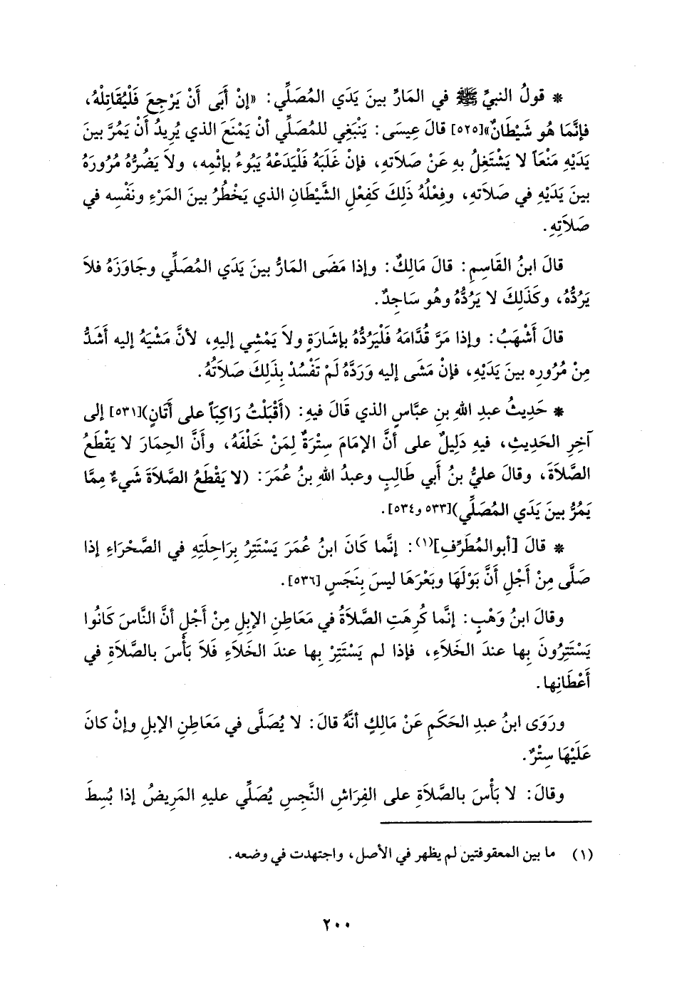 * قولُ النبيِّ - صلى الله عليه وسلم - في المَارِّ بينَ يَدَي المُصَلِّى: "إنْ أَبَى أَنْ يَرْجِعَ فَلْيُقَاتِلْهُ، فإنَّمَا هُو شَيْطَانٌ" قالَ عِيسَى: يَنْبَغِي للمُصَلِّيْ أنْ يَمْنَعَ الذي يُرِيدُ أَنْ يَمُرَّ بينَ يَدَيْهِ مَنْعَاً لا يَشْتَغِلُ بهِ عَنْ صَلَاتهِ، فإنْ غَلَبَهُ فَلْيَدَعْهُ يَبُوءُ بإثْمِه، ولَا يَضُرُّهُ مُرُورَهُ بينَ يَدَيْهِ في صَلَاتهِ، وفِعْلُهُ ذَلِكَ كَفِعْلِ الشَّيْطَانِ الذي يَخْطُرُ بينَ المَرْءِ ونَفْسِه في صَلاَتِهِ.
