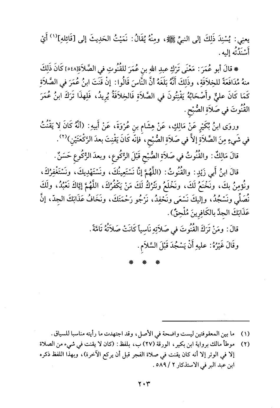 (¬2) موطأ مالك برواية ابن بكير، الورقة (27) ب، بلفظ: (كان لا يقنت في شيء من الصلاة إلا في الوتر إلا أنه كان يقنت في صلاة الفجر قبل أن يركع الآخرة)، وبهذا اللفظ ذكره ابن عبد البر في الإستذكار 2/ 589.