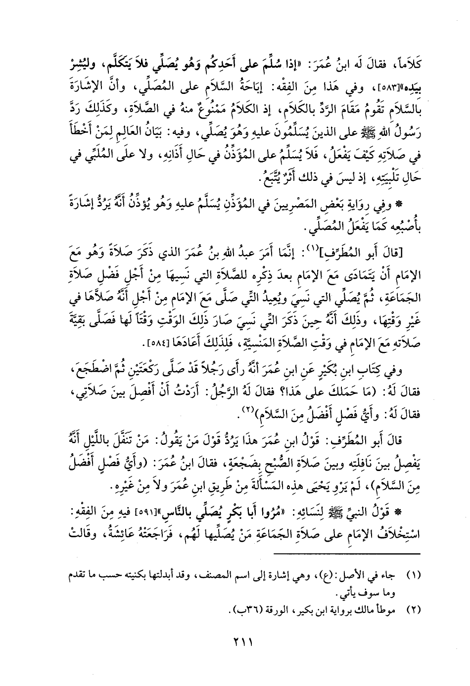 كَلاَماً، فقالَ لَه ابنُ عُمَرَ: "إذا سُلِّمَ على أَحَدِكُم وَهُو يُصَلِّي فلَا يَتكلَّم، وليشِرْ بيَدِه" [583]، وفي هَذا مِنَ الفِقْه: إبَاحَةُ السَّلَامِ على المُصَلِّي، وأنَّ الإشَارَةَ بَالسَّلاَمِ تَقُومُ مَقَامَ الرَّدِّ بالكَلاَمِ، إذ الكَلاَمُ مَمْنُوع منهُ في الصَّلَاةِ، وكَذَلِكَ رَدَّ رَسُولُ اللهِ - صلى الله عليه وسلم - على الذينَ يُسَلِّمُونَ عليهِ وَهُوَ يُصَلِّي، وفيه: بَيَانُ العَالِمِ لِمَنْ أَخْطَأَ في صَلاَتِهِ كَيْفَ يَفْعَلُ، فَلاَ يُسَلِّمُ على المُؤَذِّنُ في حَالِ أَذَانِهِ، ولا علَى المُلَبِّي في حَالِ تَلْبِيَتِهِ، إذ ليسَ في ذلك أثرٌ يُتَّبَعُ.