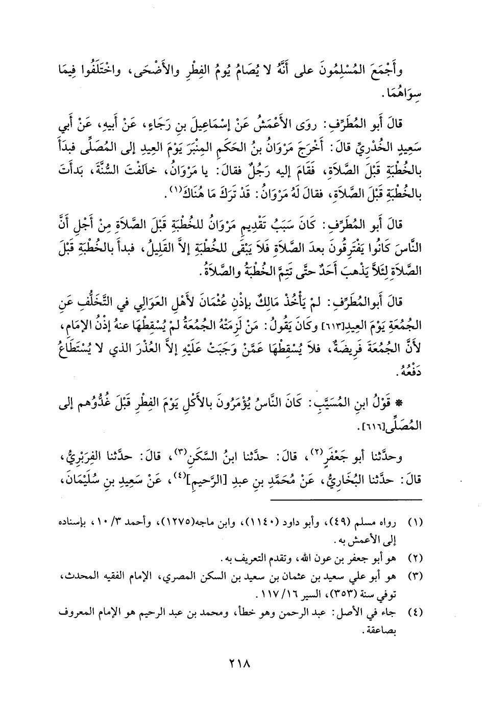 قالَ أَبو المُطَرِّفِ: روَى الأَعْمَشُ عَنْ إسْمَاعِيلَ بنِ رَجَاءٍ، عَنْ أَبيهِ، عَنْ أَبي سَعِيدٍ الخُدْرِيِّ قالَ: أَخْرَجَ مَرْوَانُ بنُ الحَكَمِ المِنْبَرَ يَوْمَ العِيدِ إلى المُصلِّى فبدَأَ بالخُطْبَةِ قَبْلَ الصَّلَاةِ، فَقَامَ إليه رَجُل فقالَ: يا مَرْوَانُ، خالفْتَ السُّنَّةَ، بَدأَتَ بالخُطْبَةِ قَبْلَ الصَّلَاةِ، فقالَ لَهُ مَرْوَانُ: قَدْ تَرَكَ مَا هُنَاكَ (¬1).