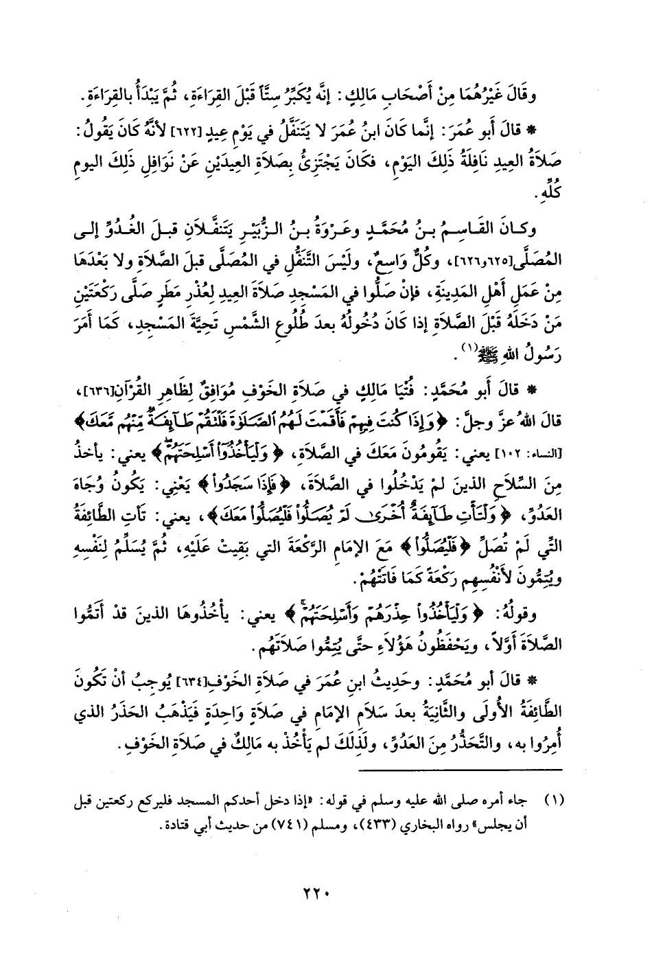 وكانَ القَاسِمُ بنُ مُحَمَّدٍ وعَرْوَةُ بنُ الزُّبَيْرِ يَتَنفَّلَانِ قبلَ الغُدُوِّ إلى المُصَلَّى [625 و 626]، وكُلٌّ وَاسعٌ، ولَيْسَ التَّنَفُلِ في المُصَلى قبلَ الصَّلَاةِ ولا بَعدَهَا مِنْ عَمَلِ أَهلِ المَدِينَةِ، فإنْ صَلوا في المسجِدِ صَلاَةَ العِيدِ لِعُذْرِ مَطَرٍ صَلَّى رَكْعَتَيْنِ مَنْ دَخَلَهُ قَبْلَ الصَّلَاةِ إذا كَانَ دُخُولُهُ بعدَ طُلُوعِ الشَمْسِ تَحِيَّةَ المَسْجِدِ، كَمَا أَمَرَ رَسولُ اللهِ - صلى الله عليه وسلم - (¬1).