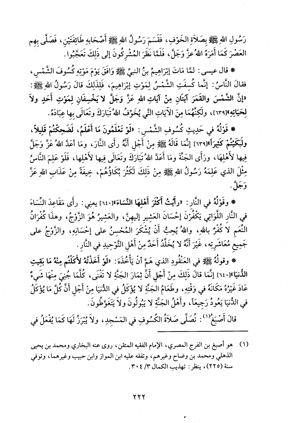 * قال عيسى: لمَّا مَاتَ إبْرَاهِيمُ بنُ النبيّ - صلى الله عليه وسلم - وَافَقَ يَوْمَ مَوْتهِ كُسُوفَ الشَّمْسِ، فقالَ النَّاسُ: إنَّما كُسِفَتِ الشَّمْسُ لِمَوْتِ إبْرَاهِيمَ، فَلِذَلِكَ قالَ رَسُولُ اللهِ - صلى الله عليه وسلم -: "إنَّ الشَّمْسَ والقَمَرَ آيتَانِ مِنْ آياتِ اللهِ -عَزَّ وَجَلَّ- لا يَخْسِفَانِ لِمَوْتِ أَحَد ولَا لِحَيَاتِهِ" [639]، ولَكِنَّهُمَا مِنَ الآيَاتِ التَّي يُخَوِّفُ اللهُ تَبَارَكَ وتَعَالَى بِهِا عِبَادَهُ.