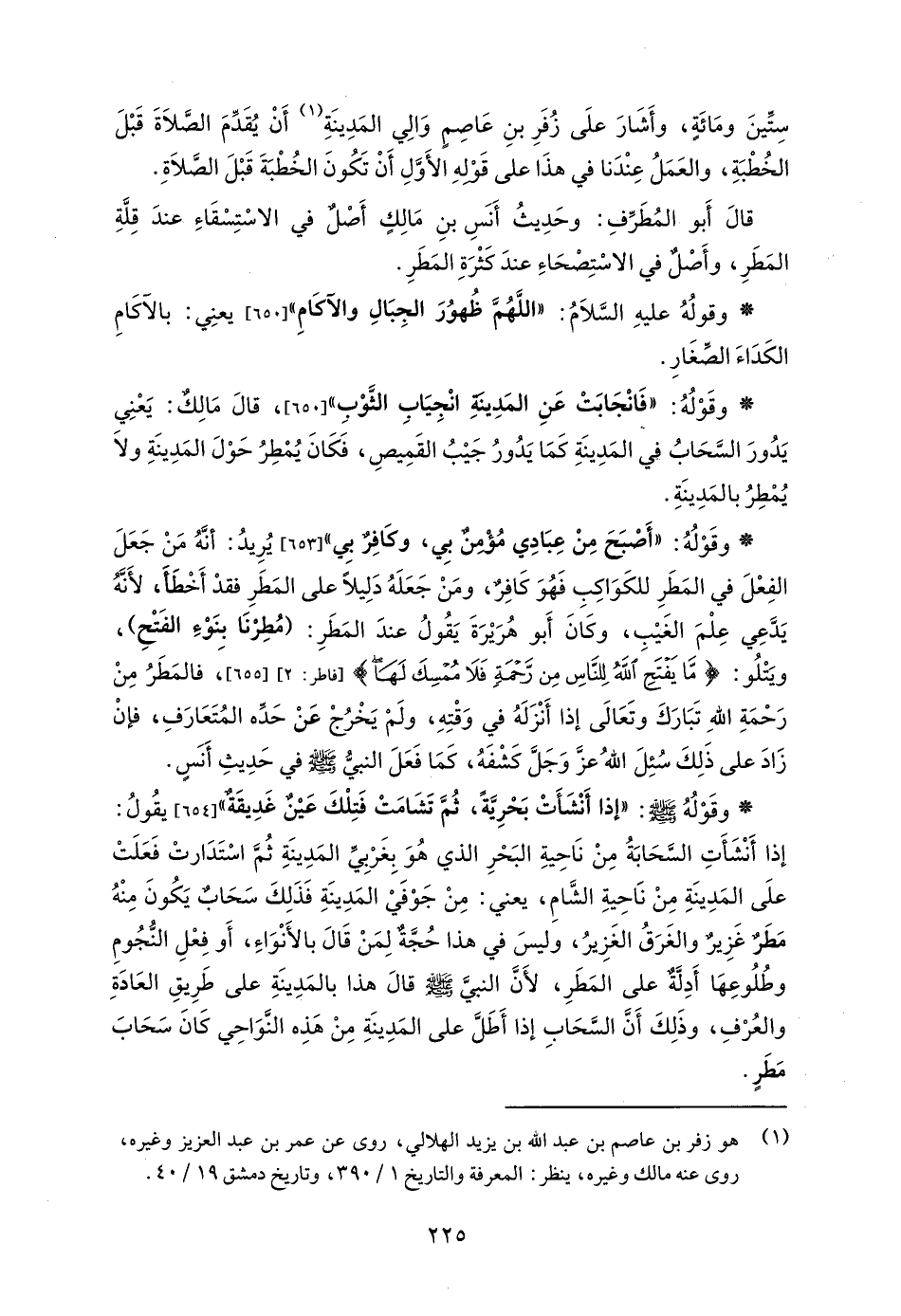 * وقَولُىُ: "أَصْبَحَ مِنْ عِبَادِي مُؤْمن بِي، وكَافِر بِي" [653] يُرِيدُ: أنَّهُ مَنْ جَعَلَ الفِعْلَ في المَطَرِ للكَوَاكِبِ فَهُوَ كَافِر، ومَنْ جَعَلَهُ دَلِيلاً على المَطَرِ فقدْ أَخْطَأَ، لأَنَّهُ يَدَّعِي عِلْمَ الغَيْبِ، وكَانَ أَبو هُرَيْرَةَ يَقُولُ عند المطَرِ: (مُطِرْنَا بِنَوْءِ الفَتْحِ)، ويَتْلُو: {مَا يَفْتَحِ اللَّهُ لِلنَّاسِ مِنْ رَحْمَةٍ فَلَا مُمْسِكَ لَهَا} [فاطر: 2] [655]، فالمَطَرُ مِنْ رَحْمَةِ اللهِ تَبَارَكَ وتَعَالَى إذا أَنْزَلَهُ في وَقْتِهِ، ولَمْ يَخْرُجْ عَنْ حَدّه المُتَعَارَفِ، فإنْ زَادَ على ذَلِكَ سُئِلَ اللهُ -عَزَّ وَجَلَّ- كَشْفَهُ، كَمَا فَعَلَ النبيُّ - صلى الله عليه وسلم - في حَدِيثِ أَنَسٍ.