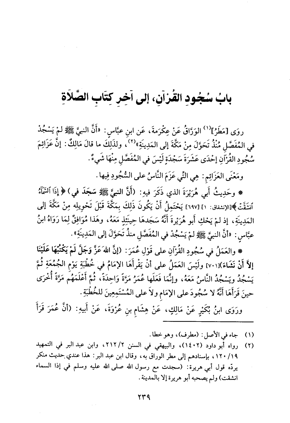 * وحَدِيثُ أَبي هُرَيْرَةَ الذي ذَكَرَ فيهِ: (أَنَّ النبيَّ - صلى الله عليه وسلم - سَجَدَ في) {إِذَا السَّمَاءُ انْشَقَّتْ} [الانشقاق: 1] [697] يَحْتَمِلُ أَن يَكُونَ ذَلِكَ بِمَكَّةَ قَبْلَ تَحْوِيلِه مِنْ مَكَّةَ إلى المَدِينَةِ، إذ لمْ يَحْكِ أَبو هُرَيْرةَ أَنَّهُ سَجَدهَا حِينَئِذٍ مَعَهُ، وهَذا مُوَافِقٌ لِمَا رَوَاهُ ابنُ عبَّاسٍ: "أنَّ النبيَّ - صلى الله عليه وسلم - لمْ يَسْجُدْ في المُفَصَّلِ منذُ تَحَوَّلَ إلى المَدِينَةِ".