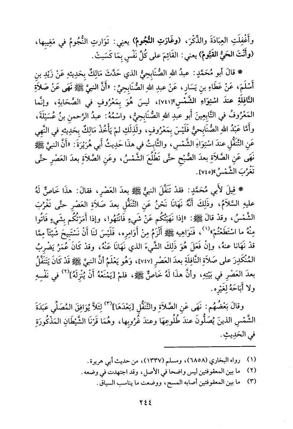 * قالَ أبو مُحَمَّدٍ: عبدُ اللهِ الصُّنَابِحِيُّ الذي حَدَّثَ مَالِكٌ بِحَدِيثهِ عَنْ زَيْدِ بنِ أَسْلَمَ، عَنْ عَطَاءِ بنِ يَسَارٍ، عَنْ عبدِ اللهِ الصُّنَابِحِيِّ: "أَنَّ النبيَّ - صلى الله عليه وسلم - نَهَى عَنْ صَلَاةِ النَّافِلَةِ عندَ اسْتِوَاءِ الشَّمْسِ" [741]، ليسَ هُوَ بِمَعْرُوفٍ في الصَّحَابةِ، وإنَّما المَعْرُوفُ في التَّابِعِينَ أَبو عبدِ اللهِ الصُّنَابِحِيُّ، واسْمُهُ: عبدُ الرَّحمنِ بنُ عُسَيْلَةَ، وأَمَّا عَبْدُ اللهِ الصنَابِحيُّ فَلَيْسَ بِمَعْرُوفٍ، ولَذِلَكِ لمْ يَأْخُذْ مَالِكٌ بِحَدِيثهِ في النَّهِي عَنِ التَّنَفُّلِ عندَ اسْتِوَاءِ الشَّمْسِ، والثَّابِتُ في هذَا حَدِيثُ أَبي هُرَيْرَةَ: "أَنَّ النبيَّ - صلى الله عليه وسلم - نَهَى عَنِ الصَّلَاةِ بعدَ الصُّبْحِ حتَّى تَطْلُعَ الشَّمْسُ، وعَنِ الصَّلَاةِ بعدَ العَصْرِ حتَّى تَغْرُبَ الشَّمْسُ" [745].